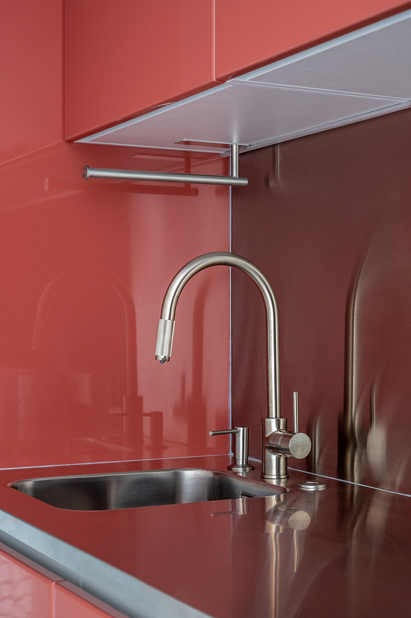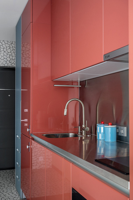 Столешницу и фартук кухни выполнили из нержавеющей стали. Фасады — из МДФ в глянцевой пленке терракотового цвета. Кухня стала основным цветовым акцентом в этом интерьере. «Изначально планировали кухню в лимонном цвете, но в ходе реализации переиграли в пользу терракоты», — отмечают авторы проекта.