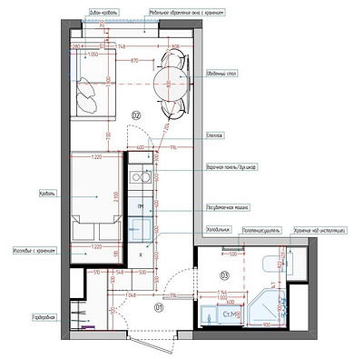 Планировка студии не стандартная — обычно это вытянутое пространство, здесь же студия Г-образная. Это позволило сделать более комфортную и эргономичную планировку: перенести кухню в проходную зону, организовать мини-гардеробную в прихожей, в комнате в нише разместить спальное место, поставить раскладной диван и обеденный стол.