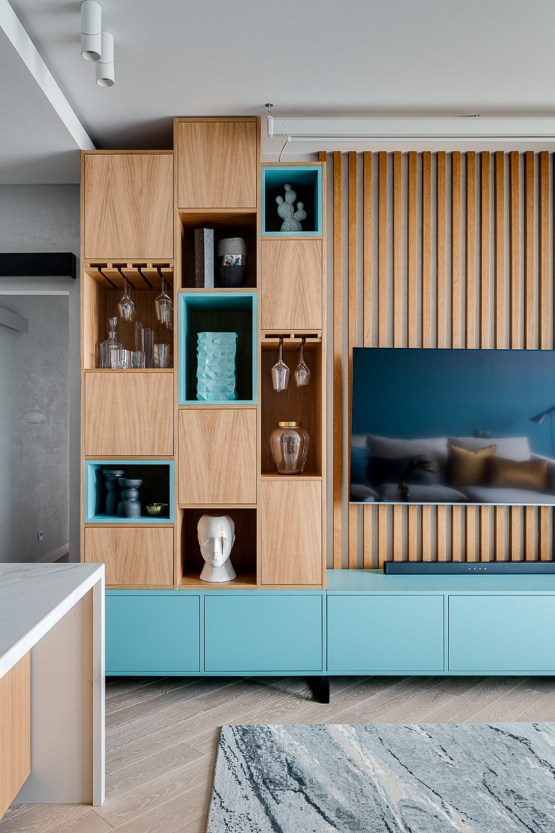 Среди стилевых пожеланий был современный стиль в нейтральных оттенках, но с присутствием насыщенного цвета. В качестве акцентного выбрали цвет морской волны — как напоминание о путешествиях к океану.