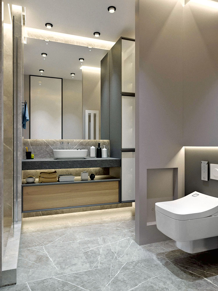 Стены в апартаментах по преимуществу покроют гладкой матовой краской и только одну, возле которой предполагается поместить тумбу с ТВ-панелью, оформят структурной штукатуркой. Также в качестве стеновой отделки используют зеркальные полотна — отражающие поверхности станут приумножать пространство, стирая границы функциональных зон и помещений.