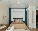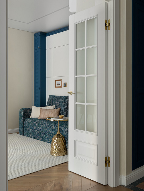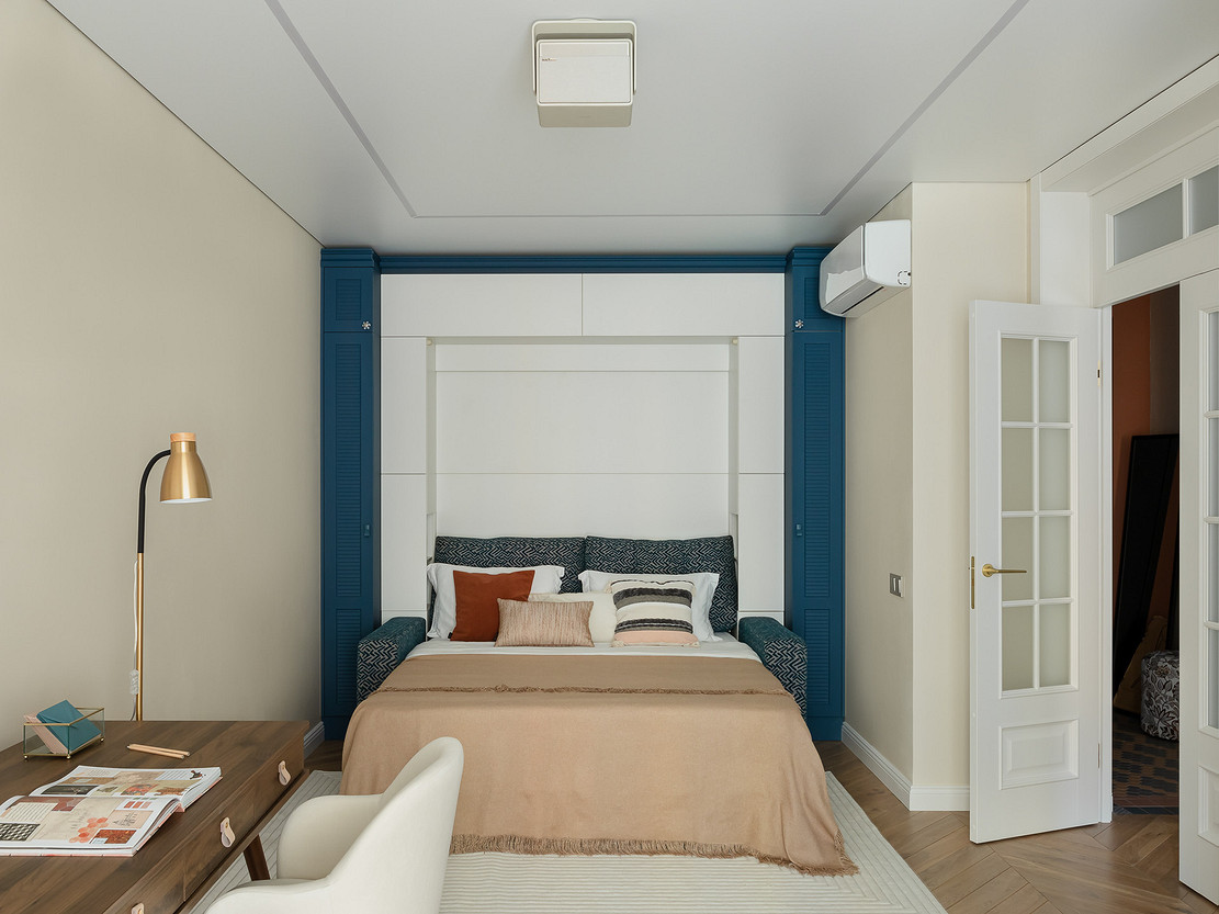 Но главная фишка проекта — кровать-трансформер. В сложенном виде это обычный диван с декоративной панелью и узкими шкафчиками по бокам. Панель откидывается, превращаясь в полноценное двуспальное спальное место. Так днем комната остается просторной гостиной с легким шкафом-буфетом и рабочим столом, а ночью становится уютной спальней.