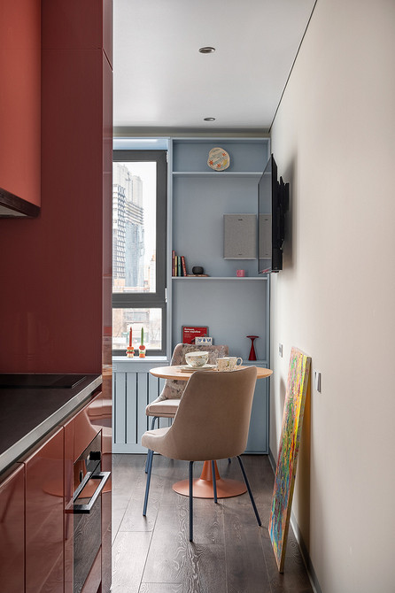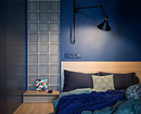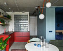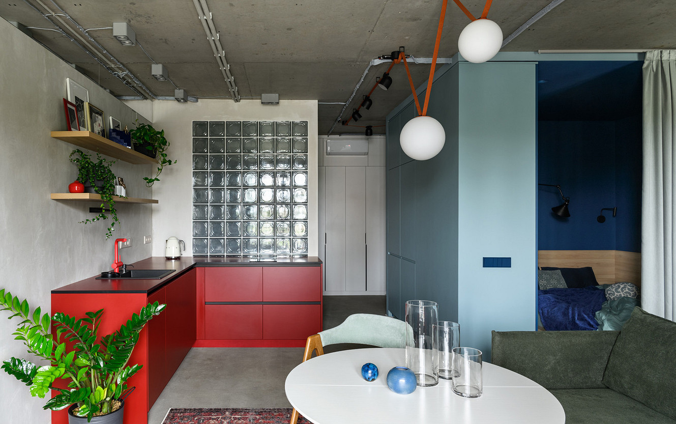 Зонирование здесь решено еще и цветом: красные акценты в активной кухне-гостиной, глубокий синий в расслабляющей спальне и свежие зеленовато-голубые тона в рабочей зоне. А стены из матовых стеклоблоков пропускают свет из кухни в ванную и из спальни — в прихожую.