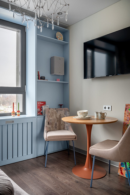 Первый проект — Г-образная студия площадью всего 23 кв. м. Дизайнеры Анастасия Галдобина и Виктория Костикова уместили здесь практически функции двушки для супружеской пары старше 60 лет.