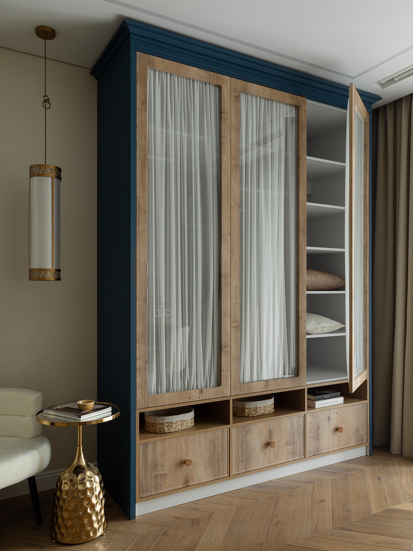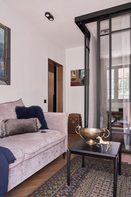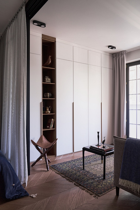 Решение — вместительные встроенные шкафы в комнате и коридоре. Их фасады выполнили в цвет стен, чтобы они «растворились» в пространстве. Но ключевой прием зонирования — стеклянная перегородка, отделившая спальню от гостиной. Она пропускает свет и не дробит объем, а штора за ней позволяет создать приватную атмосферу для сна.