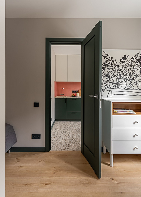 Этот проект квартиры 39 кв. м в Екатеринбурге доказывает, что даже в однушке можно обойтись без традиционной кровати, занимающей половину комнаты. Для молодой семьи дизайнер Ксения Муравьева сделала радикальную перепланировку: поменяла местами кухню и спальню (квартира расположена на втором этаже над нежилым помещением, что позволило это реализовать), а вход в комнату сделала через кухню.