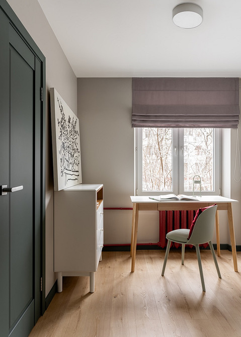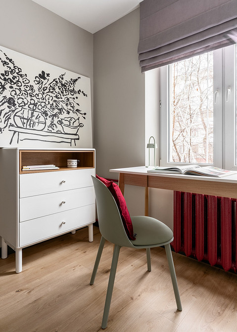 В комнате нашлось место и для небольшого кабинета. Часть мебели (прикроватный столик и табурет) переехала из старой квартиры хозяйки и стала отправной точкой для декора.