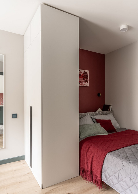 Основная хитрость — перенос дверного проема в комнату. Это позволило поставить кровать так, чтобы ее не было видно от входа, и отделить спальное место… шкафом! Конструкция работает как перегородка, создавая иллюзию отдельной комнаты. В единственной комнате не ставили диван или кресло, а решили сделать рабочее место со столом у окна и комодом. Хотя при желании небольшой диванчик можно поставить вместо стола.