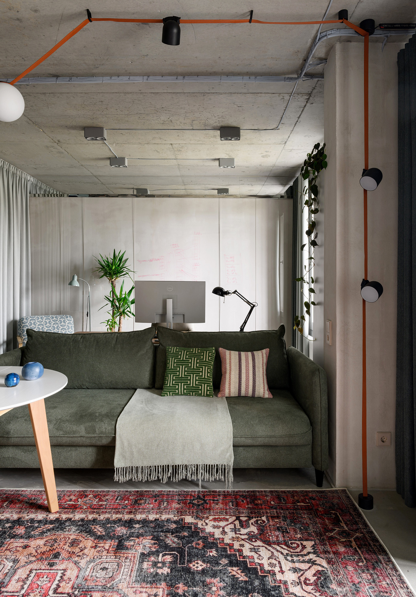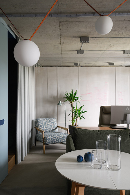 Проект для молодого IT-специалиста в Новосибирске — настоящий гимн честности материалов. Вдохновленные вопросом заказчика «Зачем имитировать бетон и дерево?», дизайнеры Анастасия Каширская и Ольга Баборень почти полностью сохранили отделку от застройщика. Бетонные стены и потолок просто отшлифовали и покрыли лаком, проводку пустили открытым способом.