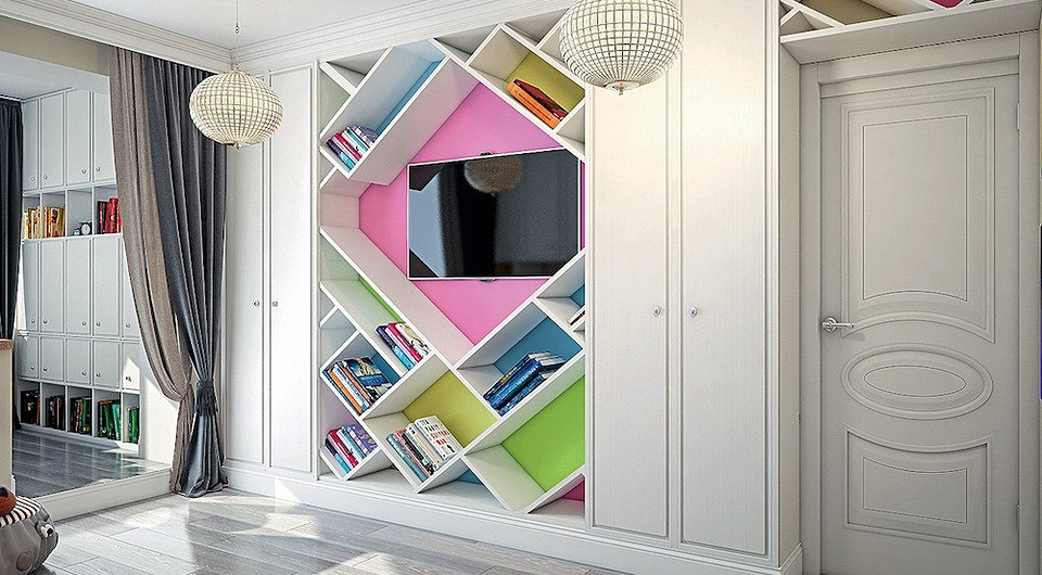 Напротив кровати расположена система хранения, при этом помещение не перегружено массивной мебелью — задняя стенка у стеллажа отсутствует, её заменяют яркоокрашенные участки стен. Кажется, что стеллаж состоит из большого количества разноцветных деталей, словно популярный детский конструктор.
