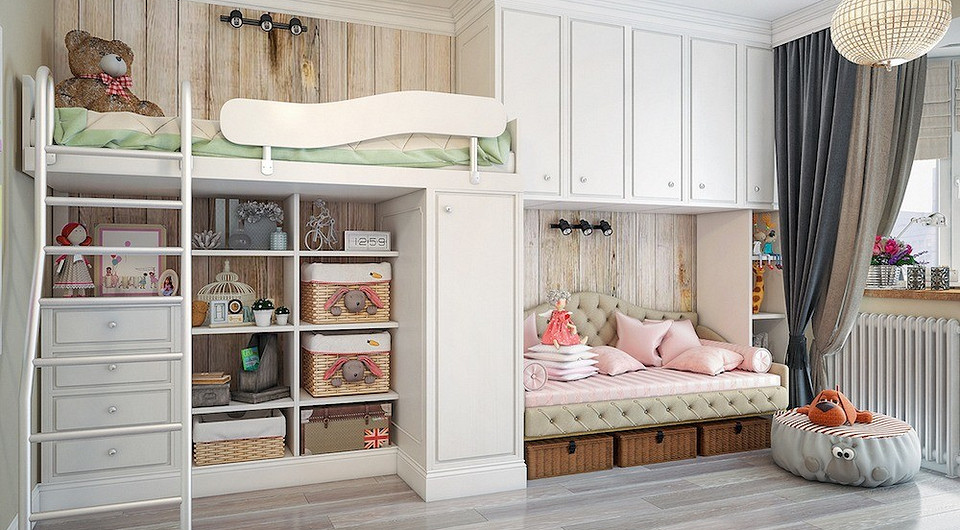 Комната спроектирована «на вырост» — с учётом появления второго ребёнка и взросления первого. Спальные места находятся рядом, но разделены высоким шкафчиком, так что дети не будут мешать друг другу.