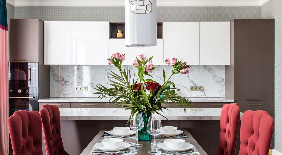 Запоминающиеся акценты расставляет авторская мебель с мягкой обивкой, а круглящиеся силуэты стульев, напоминающих распускающиеся садовые цветы, тёплые тканевые фактуры смягчают строгость прямых линий, блеск стекла и керамогранита.