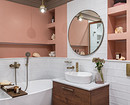Для отделки стен использовали краску светлых оттенков, дополнили их молдингами, создав геометрически правильные линии и фигуры на стенах. В жилых зонах на полу уложена инженерная доска. Кухня выделена плиткой. Такая же напольная плитка лежит на полу в прихожей и ванной комнате. В ванной использовали прием, который уже стал классическим: плитка на стенах в мокрых зонах и краска — в тех, куда не попадает вода. Причем краску выбрали достаточно яркую, кораллового цвета, — получилось элегантно.