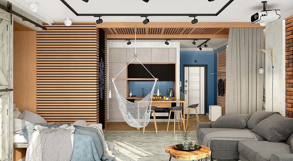 Для организации зоны ночного отдыха используют откидную кровать. Днём она будет поднята и спрятана за брутальной сдвижной дверью на амбарном механизме. Вдоль этой же стены появится система хранения для спортивного инвентаря; в простенке между ведущими в лоджию сдвижными дверьми — спортивный комплекс. Напротив зоны спальни — мини-гостиная с раскладным диваном, рядом — подвесное плетёное кресло-гамак.