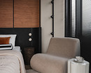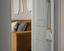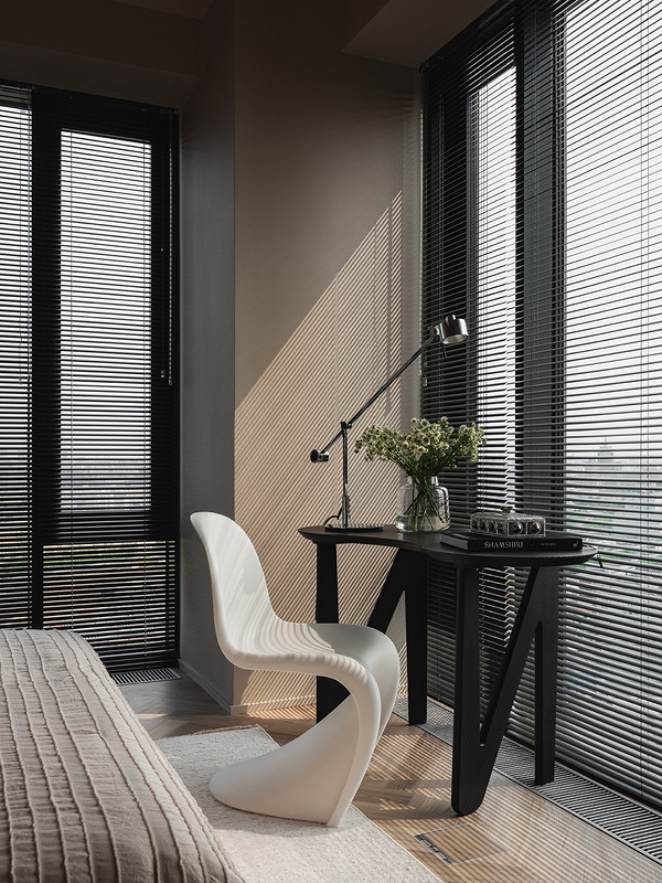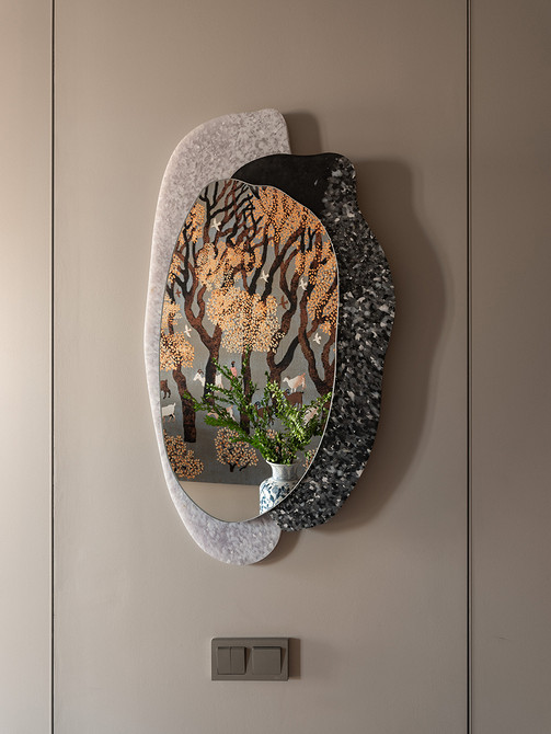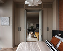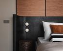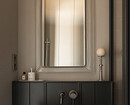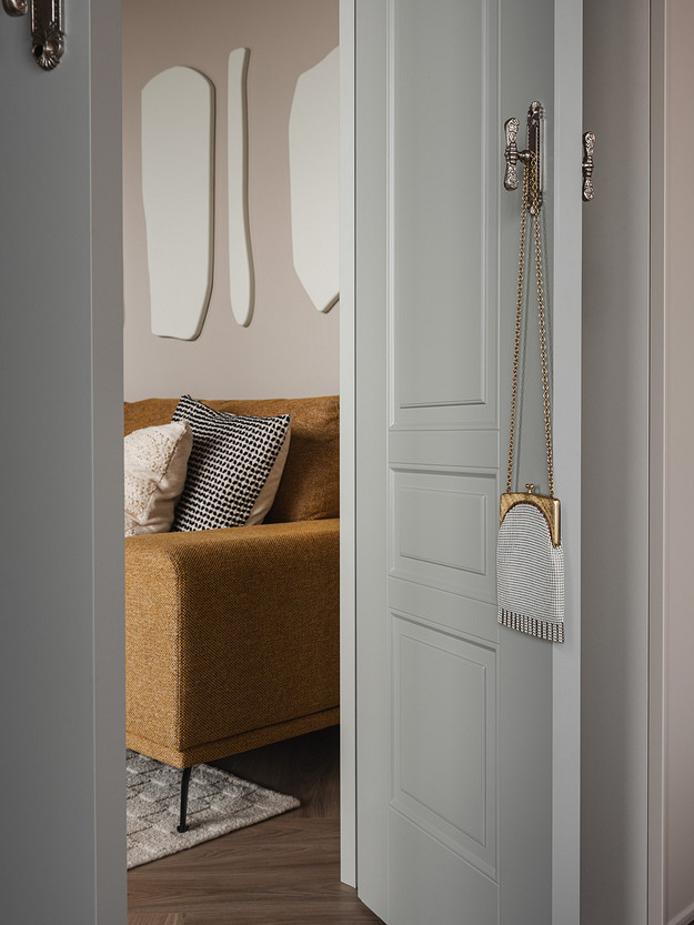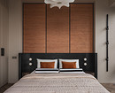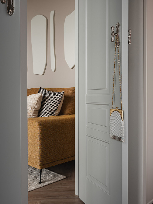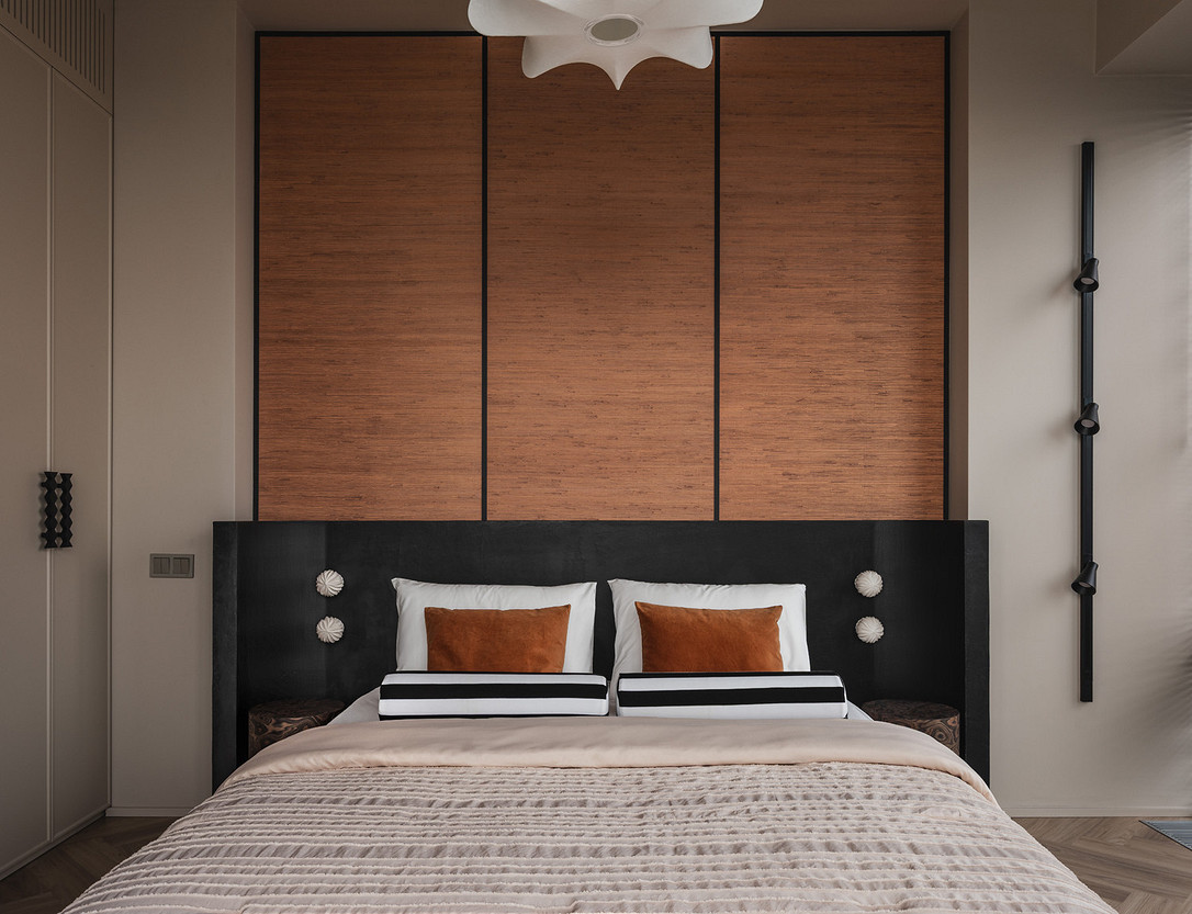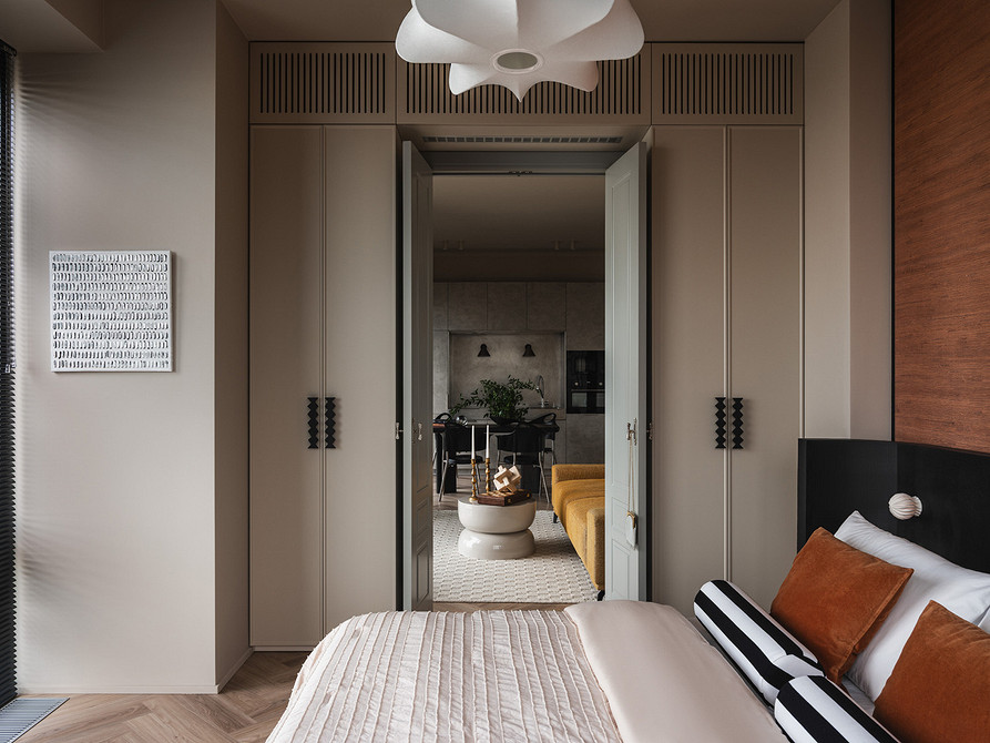 В интерьере сочетаются рациональность и рукотворность: симметрия спальни и акцентные порталы дополнены живыми деталями — ручками с неровной фактурой, декоративным панно ручной работы. Благодаря этому интерьер сохраняет баланс между структурой и индивидуальностью: он не уходит в стерильный минимализм, но и не перегружен декором. Пространство выглядит современным, сдержанным и при этом теплым, отражая философию эклектики — гармонию в сочетании разного.