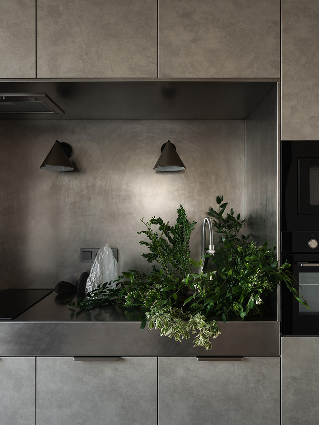 Стилистически проект задумывался в духе современной эклектики — на пересечении индустриальных поверхностей и мягких тактильных материалов. Баланс между грубым и деликатным стал ключевой темой интерьера. Среди пожеланий заказчицы было избежать избыточного серого, чтобы пространство не выглядело холодным или формальным. Палитра должна была оставаться спокойной, но с акцентами. Приветствовалось использование винтажных предметов, чтобы добавить интерьеру индивидуальности и душевности.