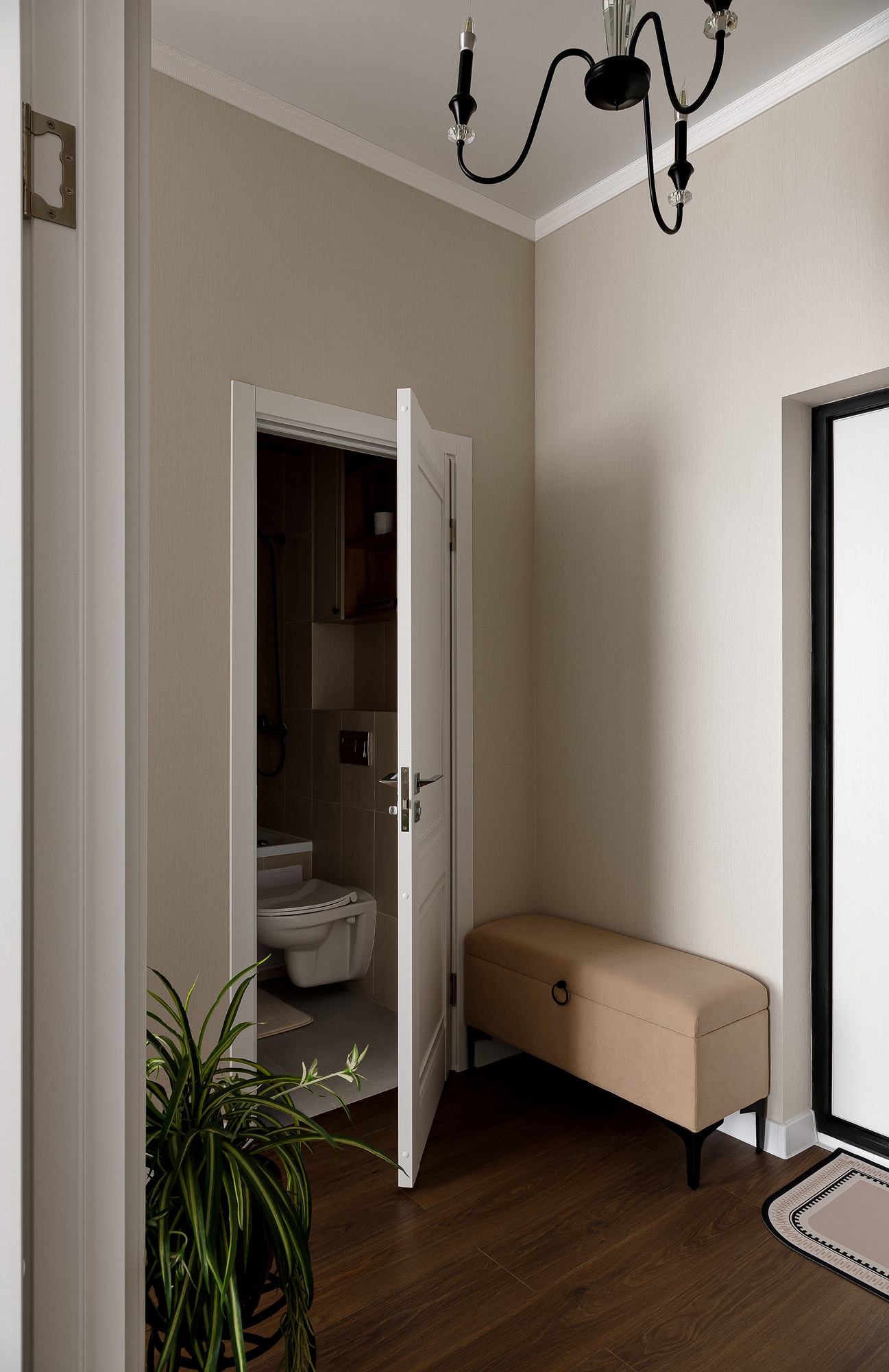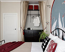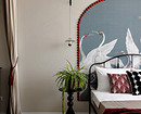 Все помещения остались на прежних местах. К плюсам квартиры можно отнести наличие помещения под небольшую гардеробную и кухню площадью 12 кв. м — здесь удалось создать кухню-столовую с обеденной зоной и зоной отдыха с диваном и телевизором. В комнате дизайнер устроила уютную спальню с элементами богемного шика — с необычным панно в декоративной арке, кроватью с кованым изголовьем и комодом в нише.
