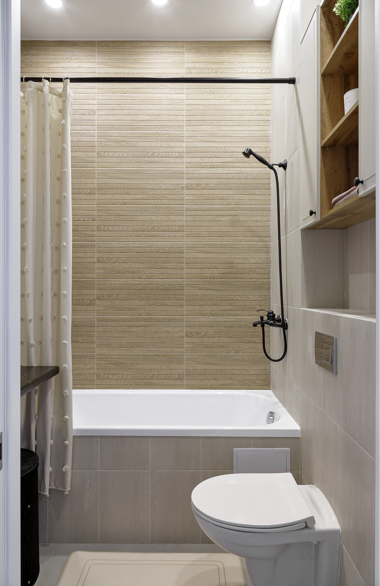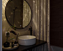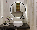 В санузле изначально была установлена ванна, ее решили оставить. Круглое зеркало с подсветкой, столешница с накладной раковиной и компактная стиральная машина дополняют функциональное решение, создавая удобное и гармоничное пространство для повседневного комфорта.