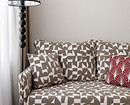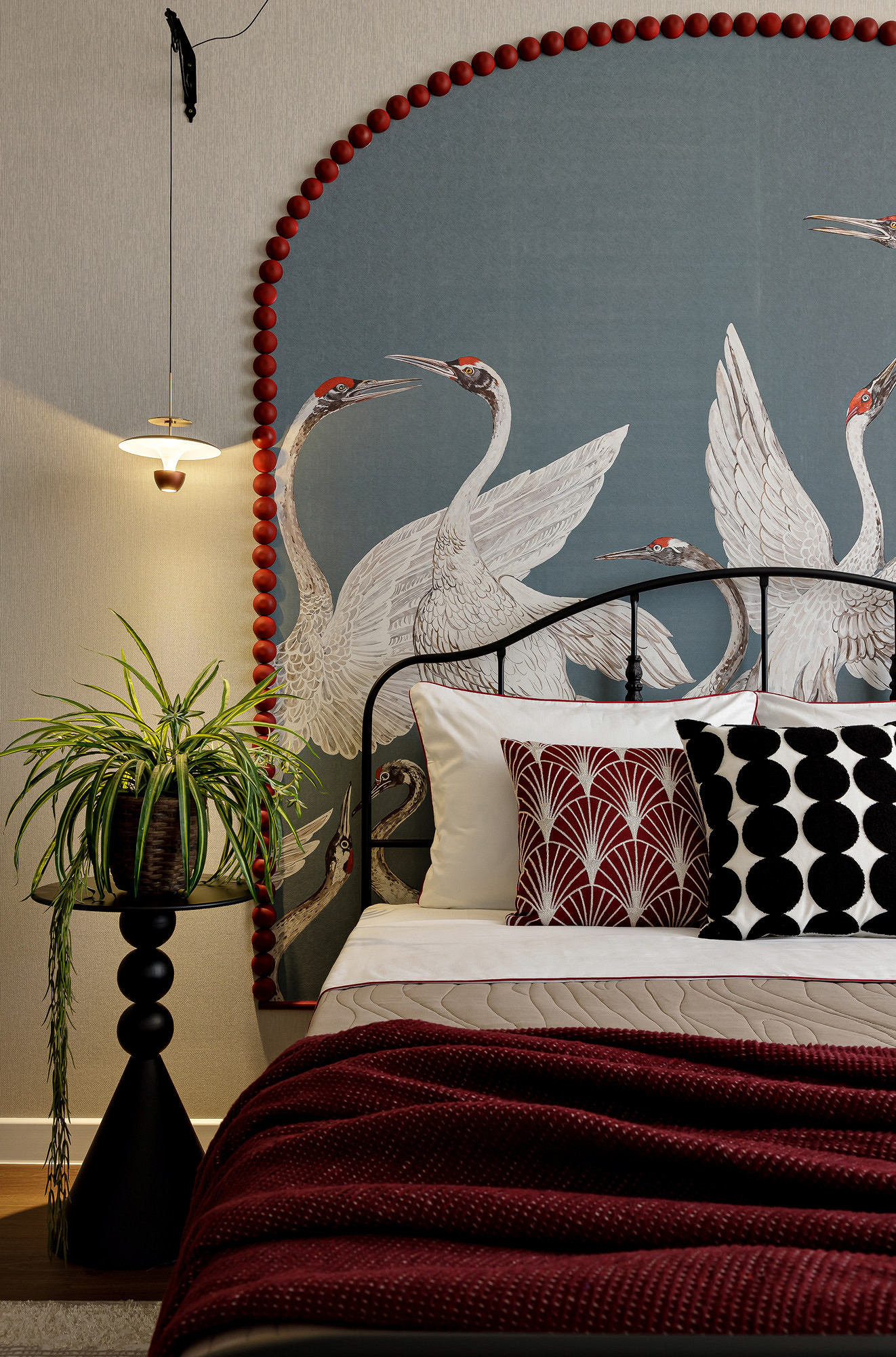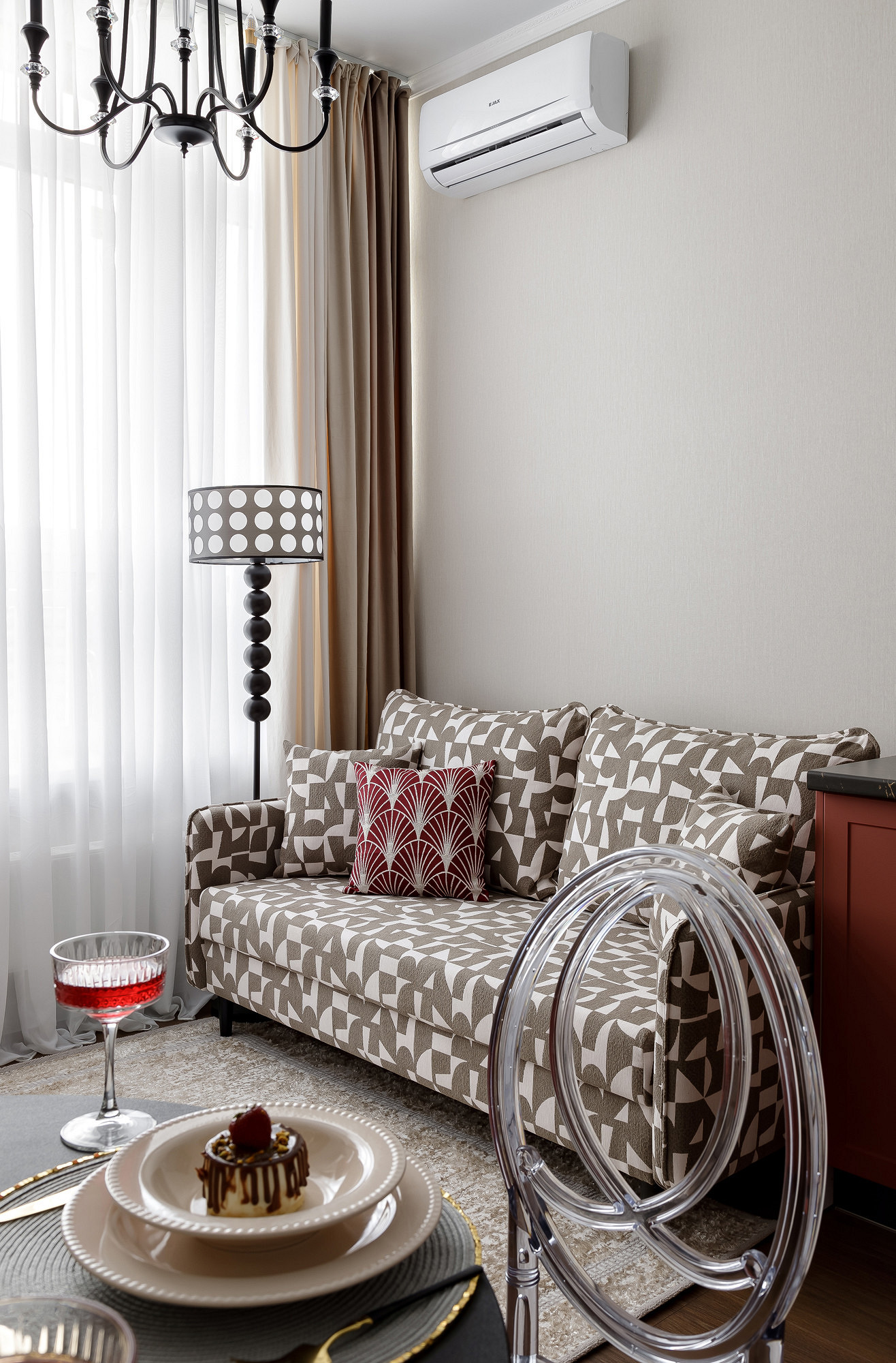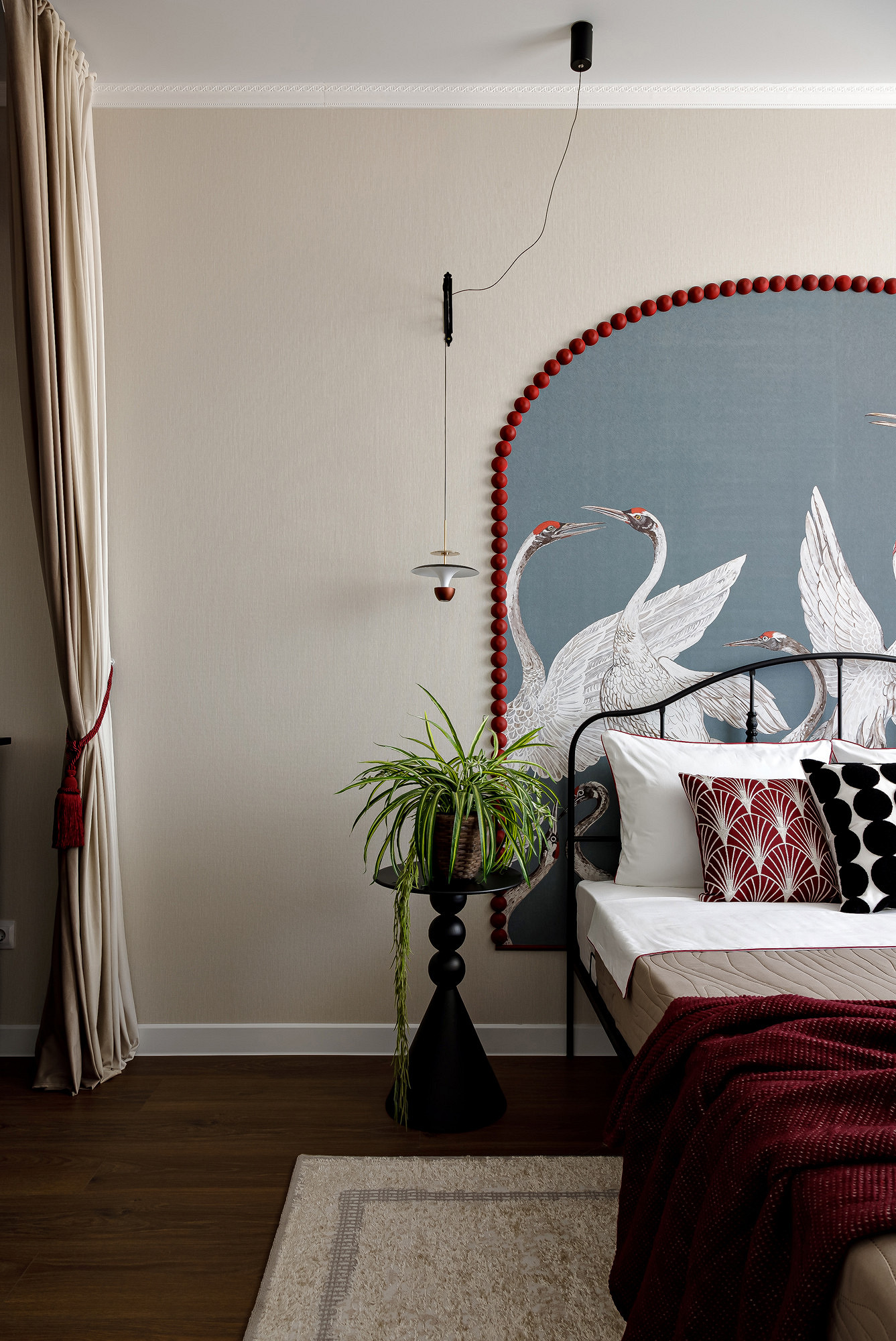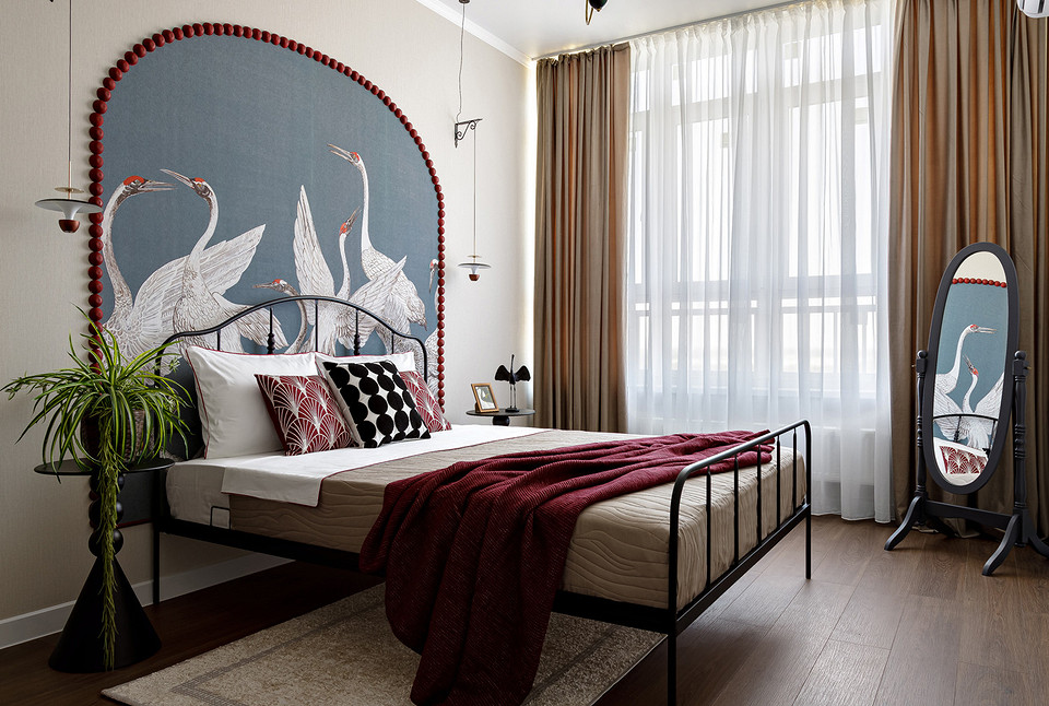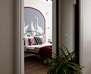 Сначала дизайнер нашла панно с журавлями и решила использовать в интерьере сложный красный оттенок их голов. Это стало точкой отсчета. Концепция росла постепенно: появились арка из красных шариков, яркая кухня, текстиль в тон. Кухню заказали в местной столярной мастерской, а шарики из гипса дизайнер отливала и красила сама. Бежевые обои стали хорошим нейтральным фоном. Обои в горошек, которыми декорирована квартира, а также тема круга, повторяющаяся в текстильном декоре, светильниках, обрамлении арки, задают настроение легкости, непринужденности, изящества. Благодаря такому разнообразию декора квартиру интересно рассматривать в деталях и она кажется больше, чем если бы была полупустой.