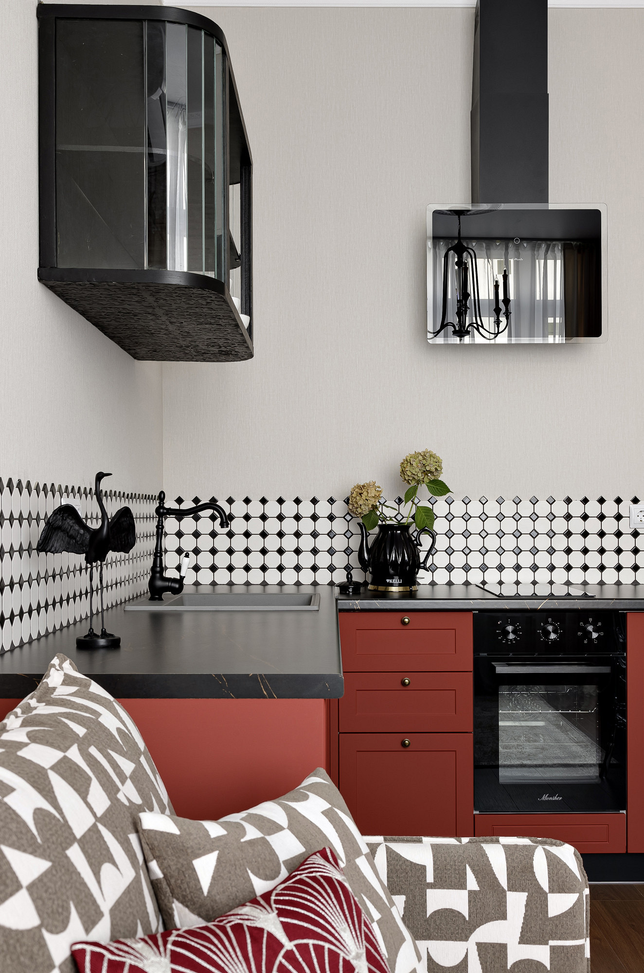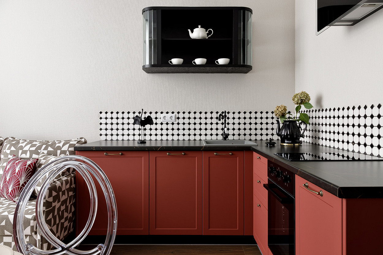 терракотовые фасады мебели создают выразительный акцент, на фоне которого эффектно звучат графичные детали — черно-белая плитка фартука, лаконичная люстра и торшер с геометрическим абажуром.