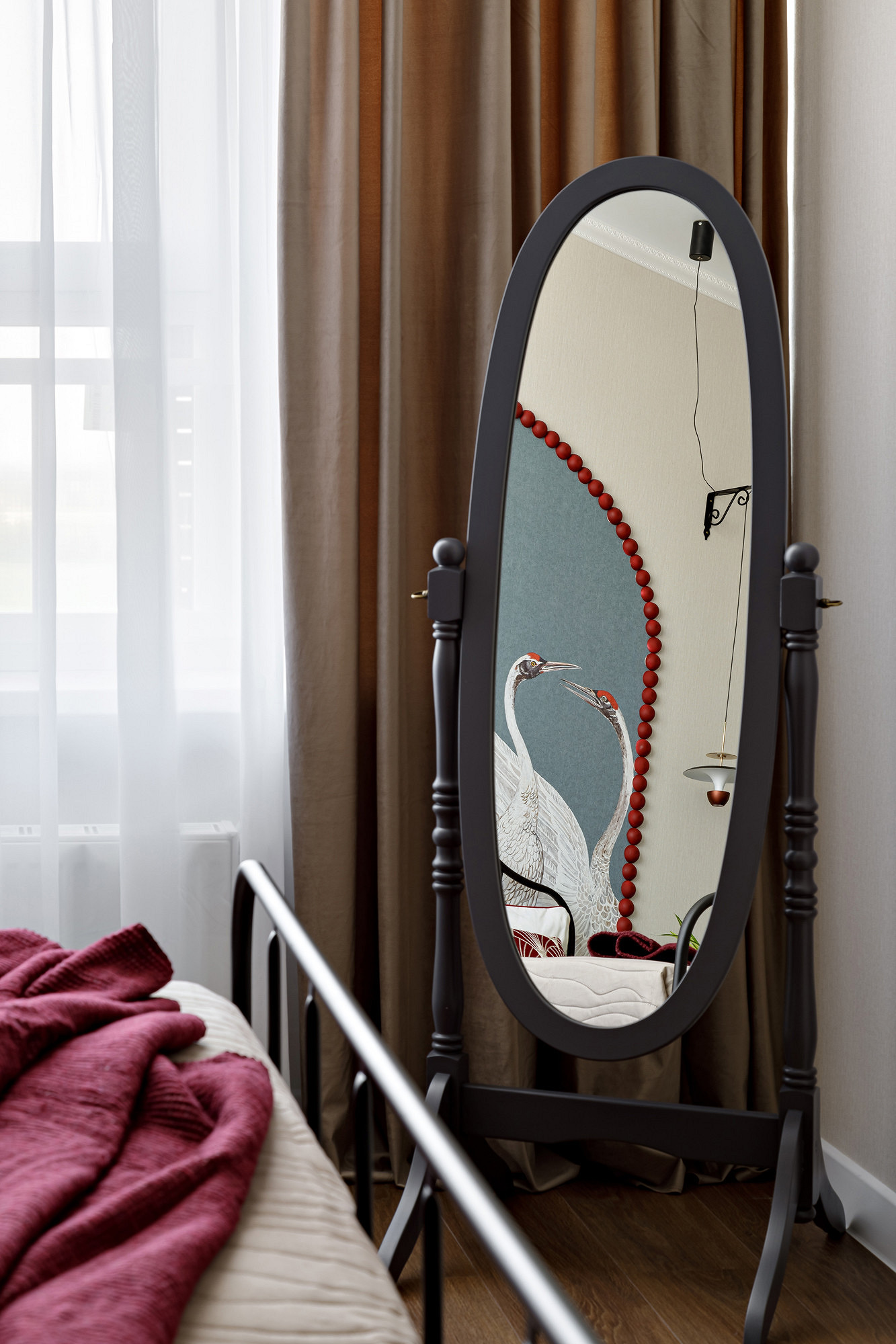 В спальне — изголовье кровати из металла под чугун, черные подвесы светильников, пропущенные через черные литые кронштейны. Это изящное решение возникло как вынужденное: рабочие заложили электрику для подвесных светильников впритык к боковинам кровати (фактически над головой). Чтобы их разнести на комфортное расстояние, Ольга придумала установить кронштейны на стене, и подвесные светильники теперь располагаются над прикроватными столиками.