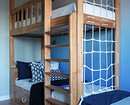 В детской установили кровати непростой конструкции: два спальных места внизу и одно — наверху. Напротив — шкаф с секциями для одежды, книг и игрушек.