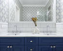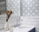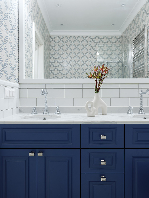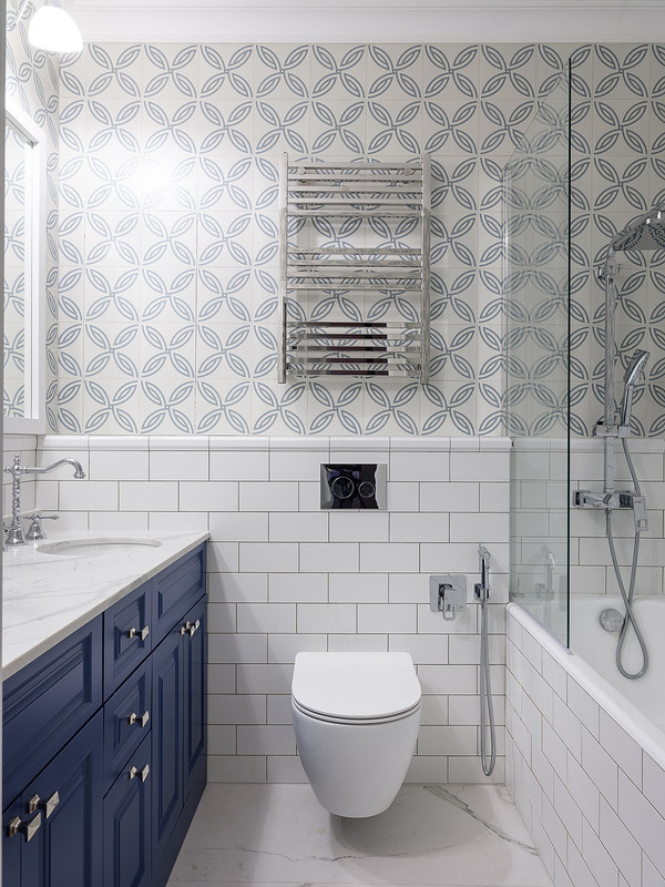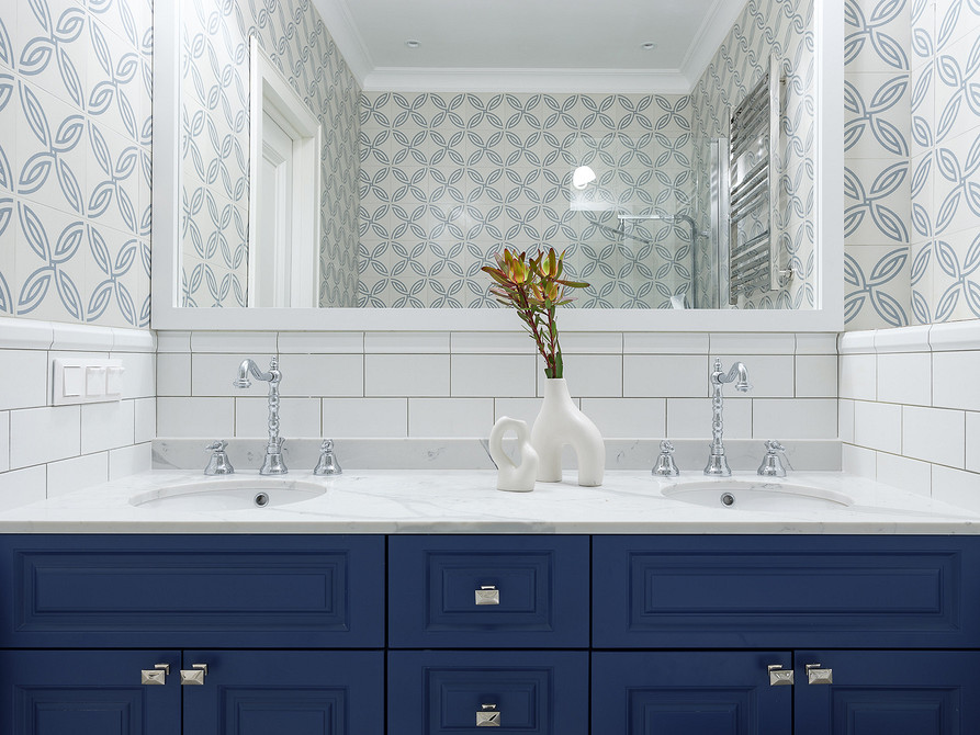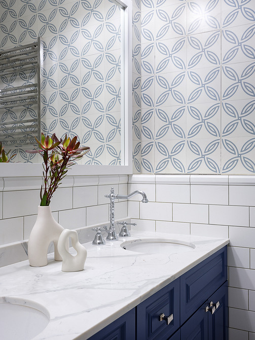 В ванной комнате скомбинировали разные виды плитки. На полу — керамогранит под мрамор. Нижняя часть стен отделана белой прямоугольной плиткой. А верхняя — плиткой с рисунком. Последнюю можно принять за обои, она выглядит декоративно, но ненавязчиво. При этом абсолютно практична.