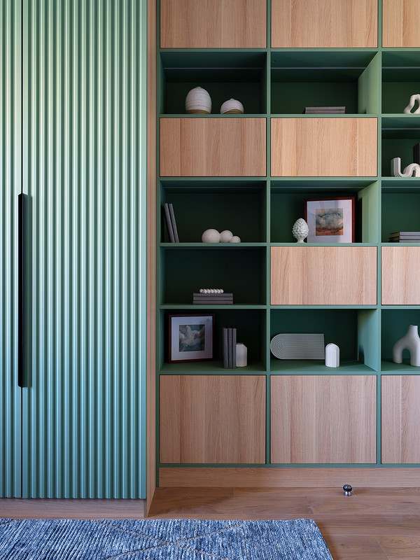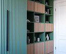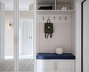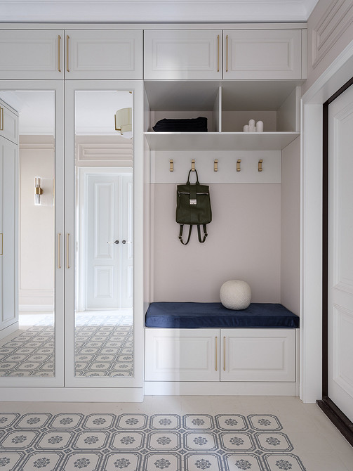 Отдельной гардеробной или кладовки в квартире нет, поэтому дизайнер продумала шкафы в каждом помещении. В просторной прихожей установили угловой шкаф с секцией с крючками для повседневной одежды, банкеткой и местом для обуви под ней, а также открытой полкой для удобного хранения шапок и шарфов.