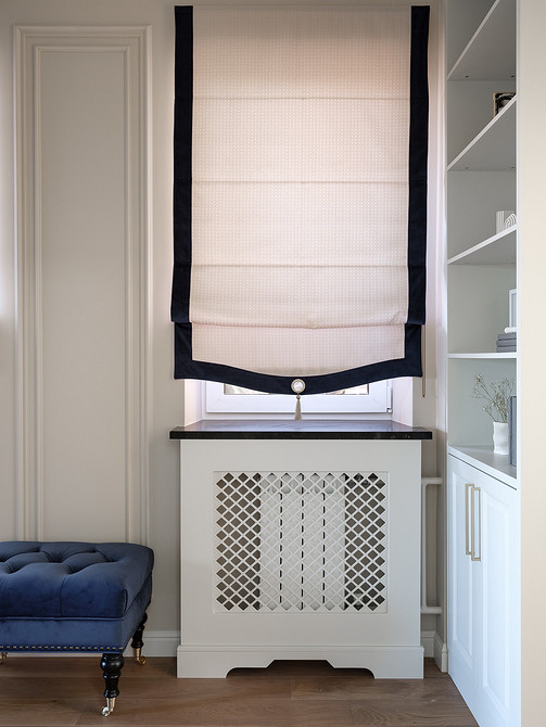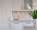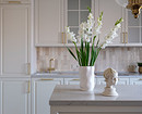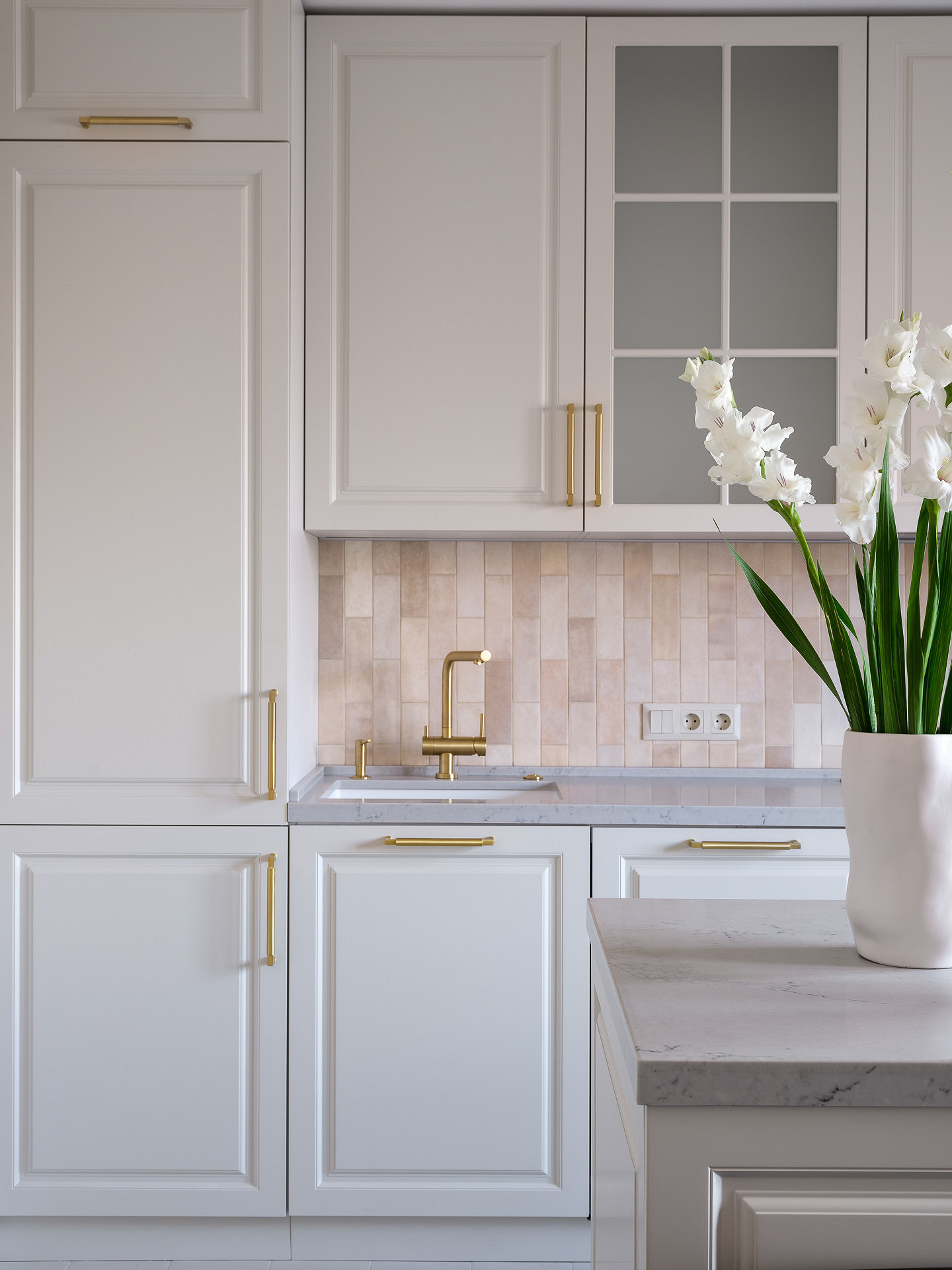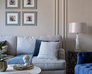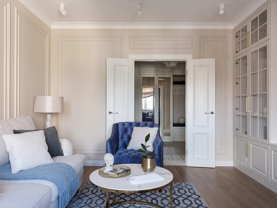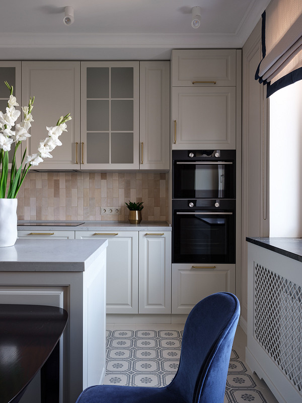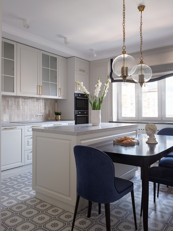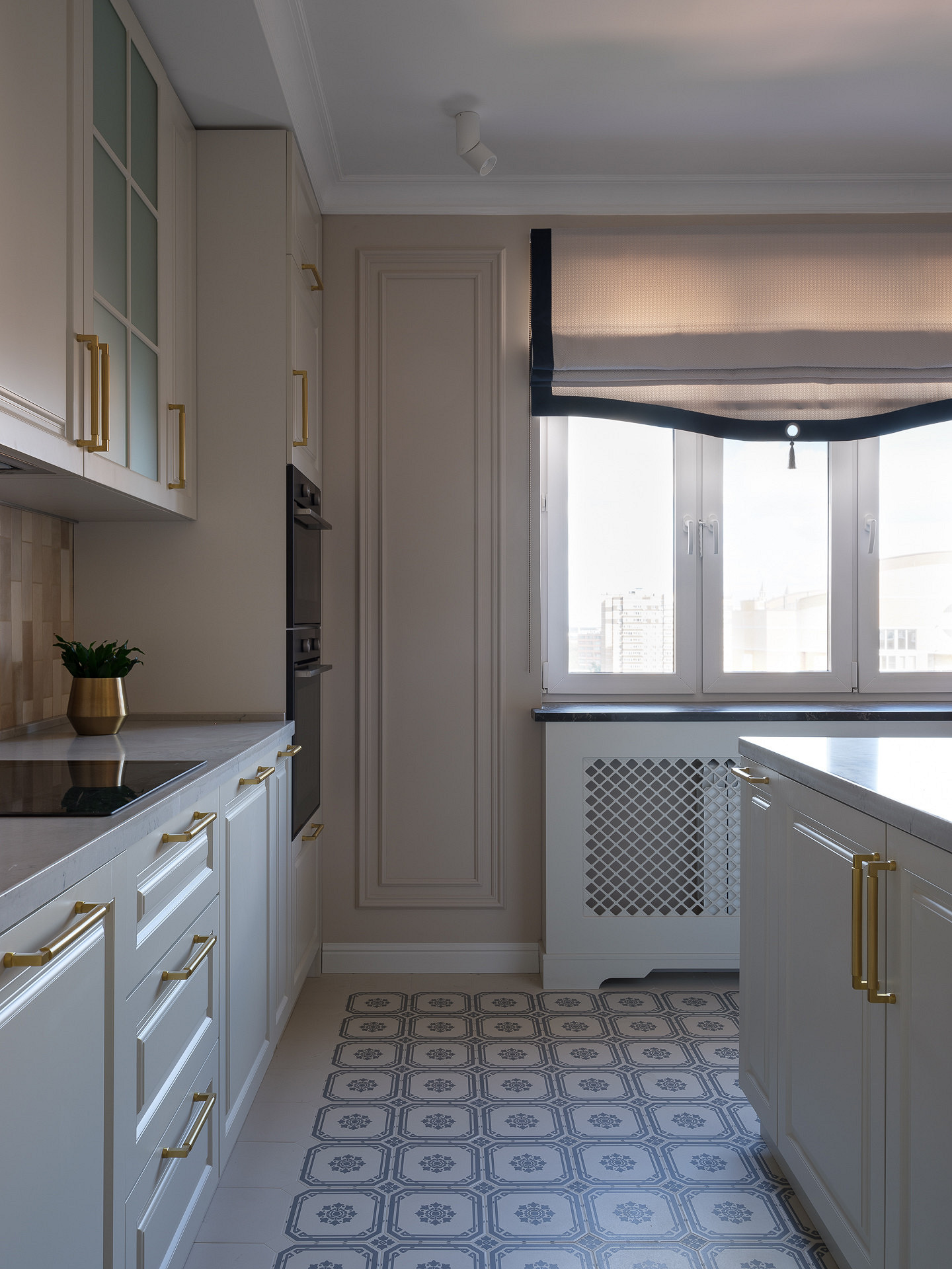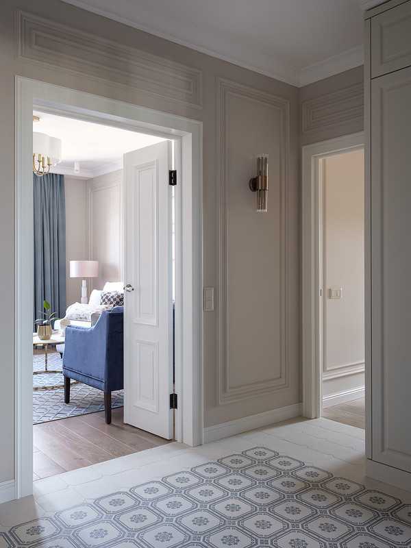 В отделке стен использовали краску и молдинги, которые подчеркнули выбранную классическую стилистику. Той же цели послужили высокие потолочные карнизы и белые напольные плинтусы. На пол в комнатах уложили инженерную доску под маслом. Для прихожей, коридора и кухни выбрали плитку: светлую скомбинировали с плиткой с рисунком из той же коллекции, получился красивый керамический «ковер».