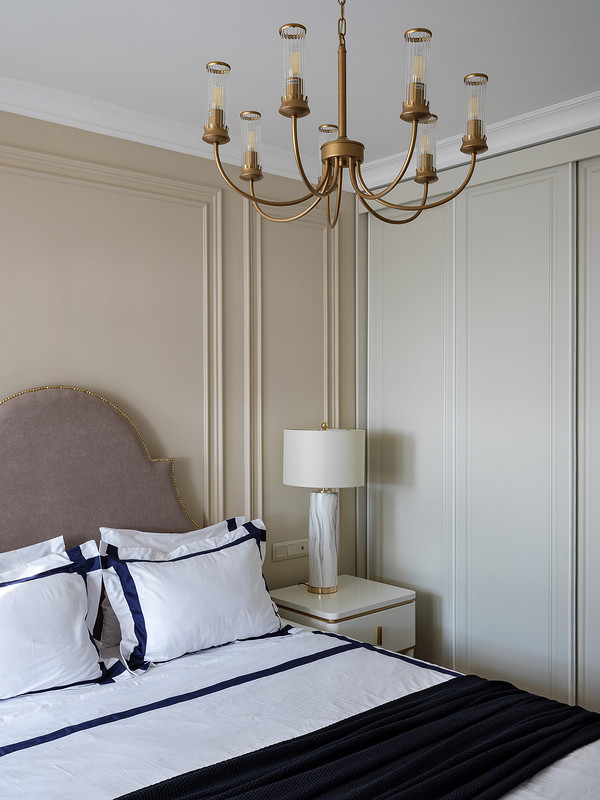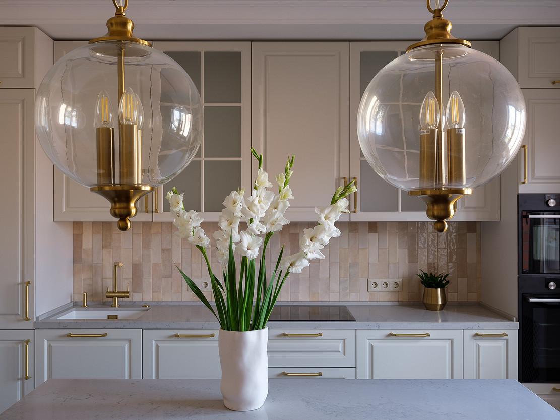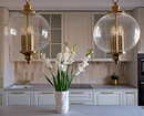 Потолок не хотели сильно занижать, поэтому выбрали не встроенные, а накладные точечные светильники. Предусмотрели потолочные люстры — в гостиной, спальне, прихожей. Дополнительные сценарии света разные: над кухонным островом два подвеса, в детской и ванной комнате — бра, в спальне и гостиной — настольные лампы.