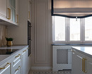 Размер кухни позволил создать удобную островную планировку. Основная часть гарнитура линейная, с колоннами по обеим сторонам со встроенными холодильником, духовым шкафом и СВЧ.