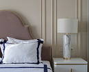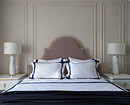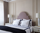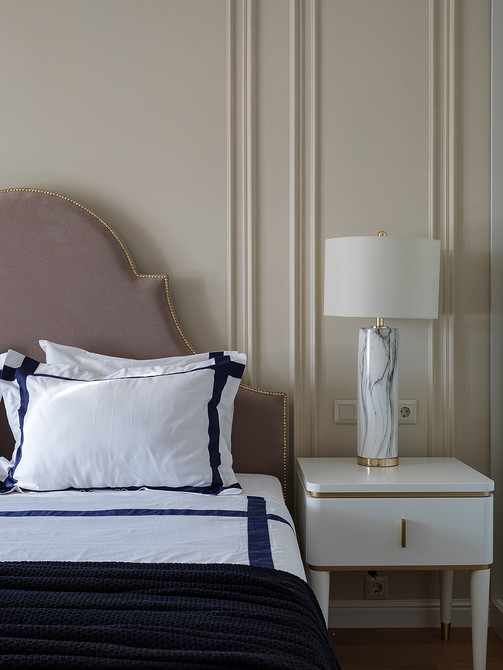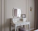 Напротив кровати поставили туалетный столик, а по бокам — одинаковые прикроватные тумбочки. Кровать выбрали в соответствующем стиле с высоким фигурным изголовьем.