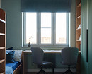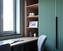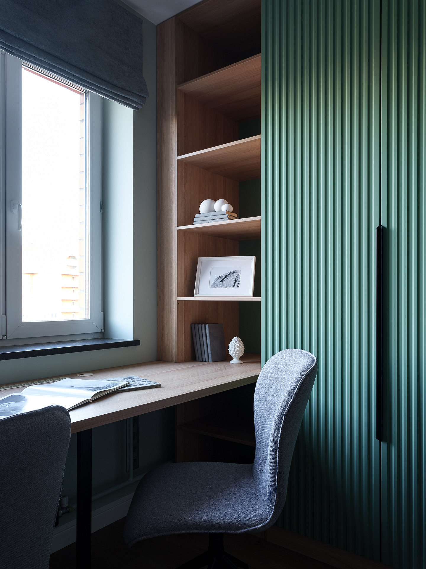 У окна продумано рабочее место и там же — стеллаж как часть шкафа.