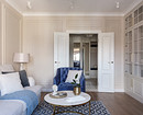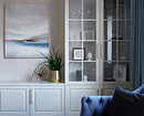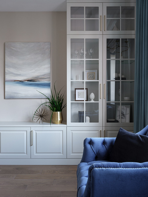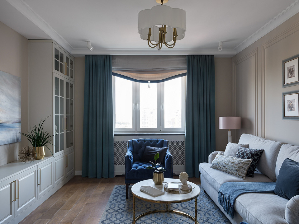 В гостиной собрали мягкую группу с классическом стиле: диван, два одинаковых кресла и круглый журнальный столик. Напротив — аналог «стенки», напольная тумба и две симметричные витрины. Посередине предполагается место для телевизора.