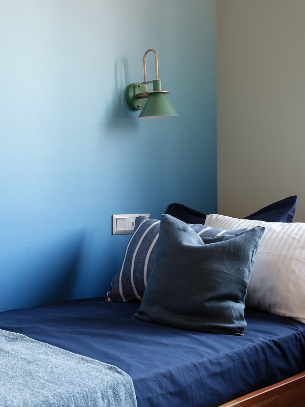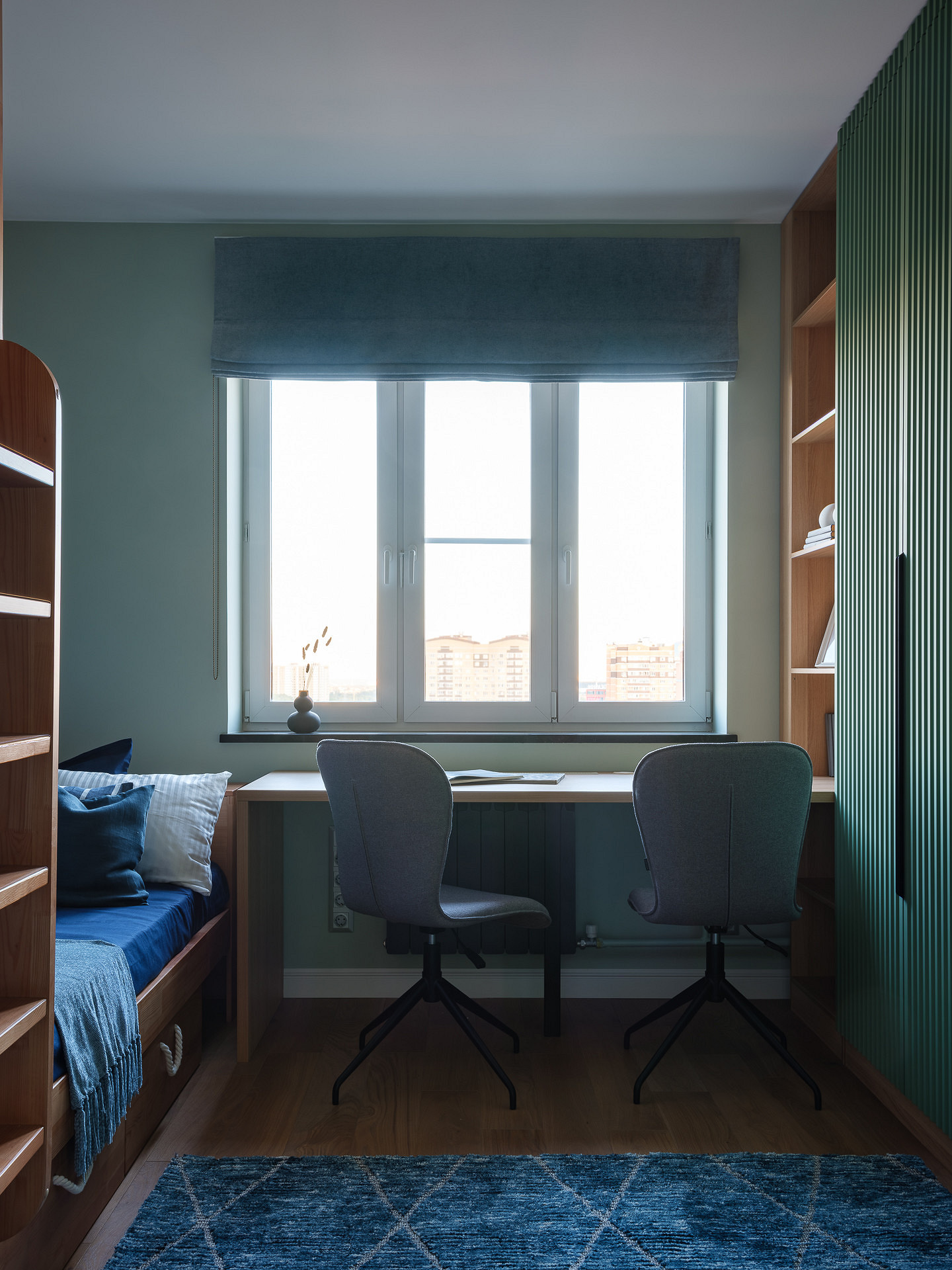 Единственная комната, оформленная в современном стиле — детская для трех мальчиков. Дизайнер отказалась от молдингов и светлых бежевых оттенков. В интерьере использовали голубую и зеленую гамму, а на стене, где стоят кровати, поклеили обои с эффектом градиента.