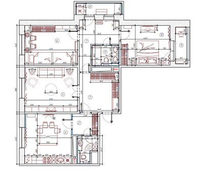 Квартира расположена в доме, где несущие практически все стены, поэтому перепланировку сделать было нельзя. Работали с имеющимся пространством: три изолированные комнаты, просторная кухня, два санузла, два балкона. В одном из санузлов организовали еще и постирочную. Коридоры постарались задействовать с пользой для размещения систем хранения.