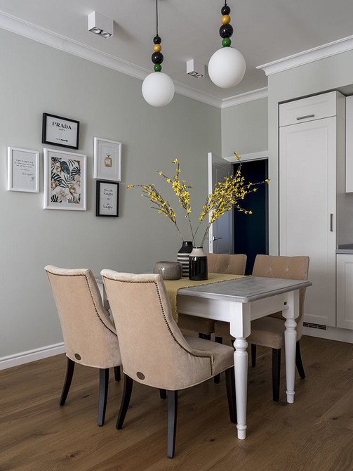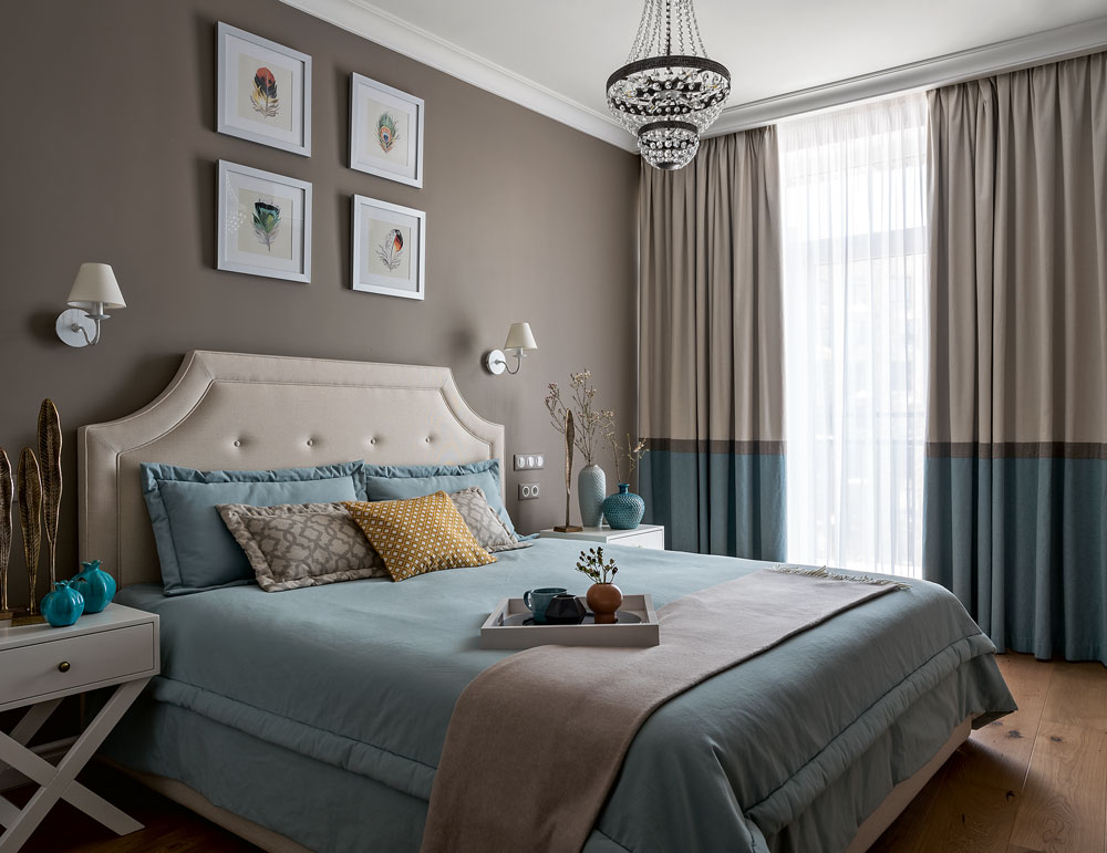 Квартира оформлена в современном смешанном стиле. Здесь можно найти отдельные черты и скандинавского минимализма, и классики, и ретро. За классику, например, отвечают люстра в спальне и кровать со стёганым изголовьем. За ретро — диван и кресло в стиле 1950-х, а за скандинавский стиль — светлые деревянные полы, столик и торшер из светлого дерева. При всём лаконизме и отсутствии лишних деталей здесь создана тёплая жилая атмосфера. Стены окрашены, и это касается даже санузлов. К каждому помещению подбирался свой цвет, оттенки получились сложные, глубокие: голубой в прихожей, жемчужно-серый в кухне-гостиной, серо-коричневый в спальне, горчичный в одном из санузлов. В качестве объединяющего, общего для всех помещений, выбран белый: двери, мебель, отделка. Комбинированные шторы и подушки на кроватях и диване, подобранные в цвет стен и в пару к другому текстилю, выполнены на заказ по эскизам автора проекта.