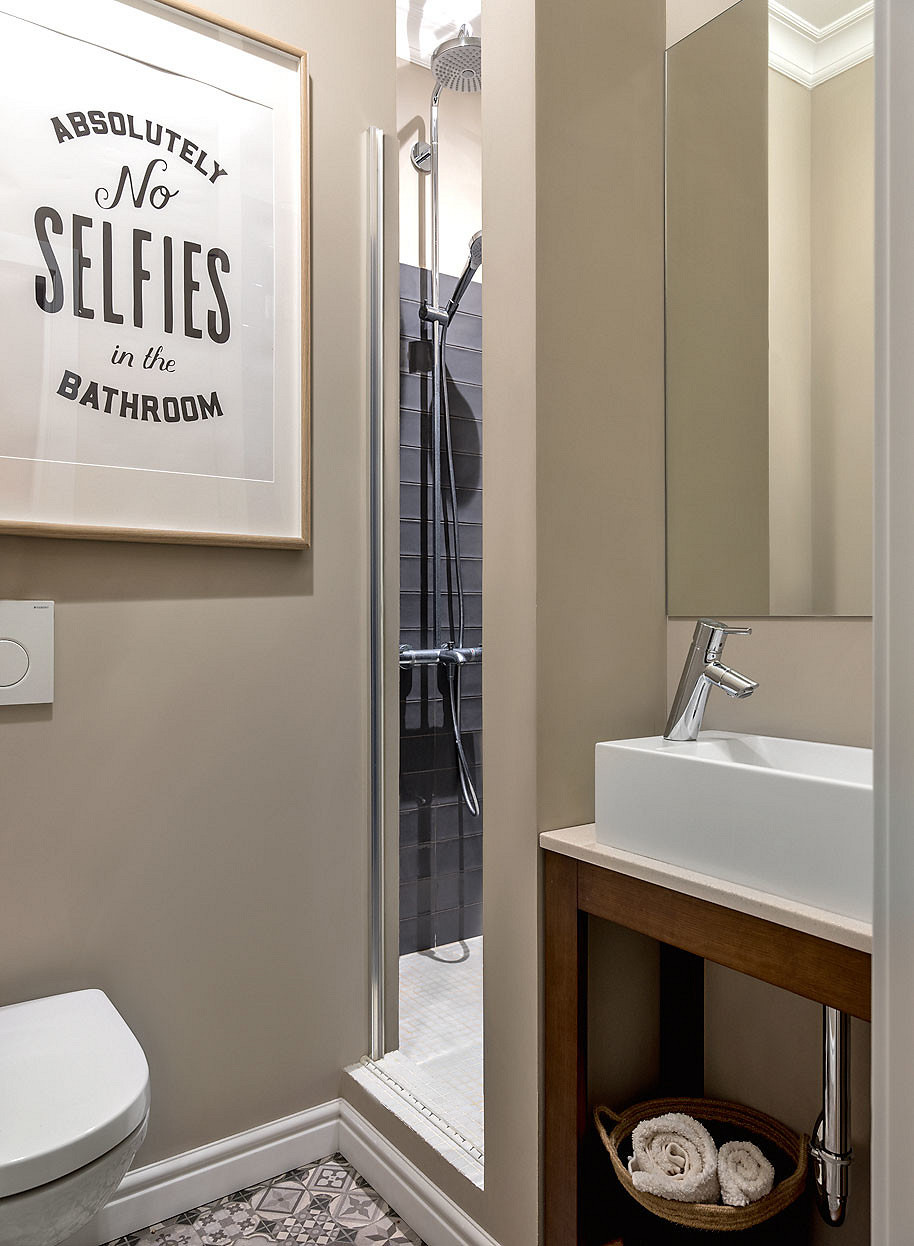 В квартире два санузла — один с ванной, другой, по желанию заказчиков, с душевым отсеком. Дизайнер не стала, следуя традиции, полностью выкладывать стены облицовочной плиткой. Влагостойкая краска насыщенных оттенков придаёт санузлам более жилой вид