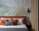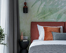 Вообще, зеленый в проекте использован в качестве акцента: это и краска на настенных панелях, и цвет кухонных фасадов, и гамма фрески на стене за кроватью, и плитка в санузле. Зеленый разной насыщенности сочетается с терракотовым в обивке кровати, розовой обивкой стульев, деревянными фактурами и нейтральными цветами: бежевым (в виде обоев на стенах) и серым (покрывало на кровати и обивка дивана).