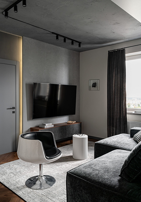Так как основной концепцией выбрали минимализм, отделка соответствующая: краска на стенах, фактурные акценты в виде декоративной штукатурки (спальня, потолок и ТВ-зона в гостиной), на полу уложен кварцвинил под дерево в раскладке «елочка». Кварцвинил практичнее ламината и не такой капризный, как дерево. Оптимальный выбор для современного интерьера.