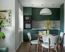 Кухня получилась очень вместительной. Выбрали гладкие фасады зеленого цвета (в поддержку цвету — диван в зеленой обивке в гостиной). Холодильник, духовой шкаф и СВЧ встроили в колонны по бокам. В одном из нижних шкафов — посудомоечная машина. Все остальные отданы под хранение.