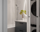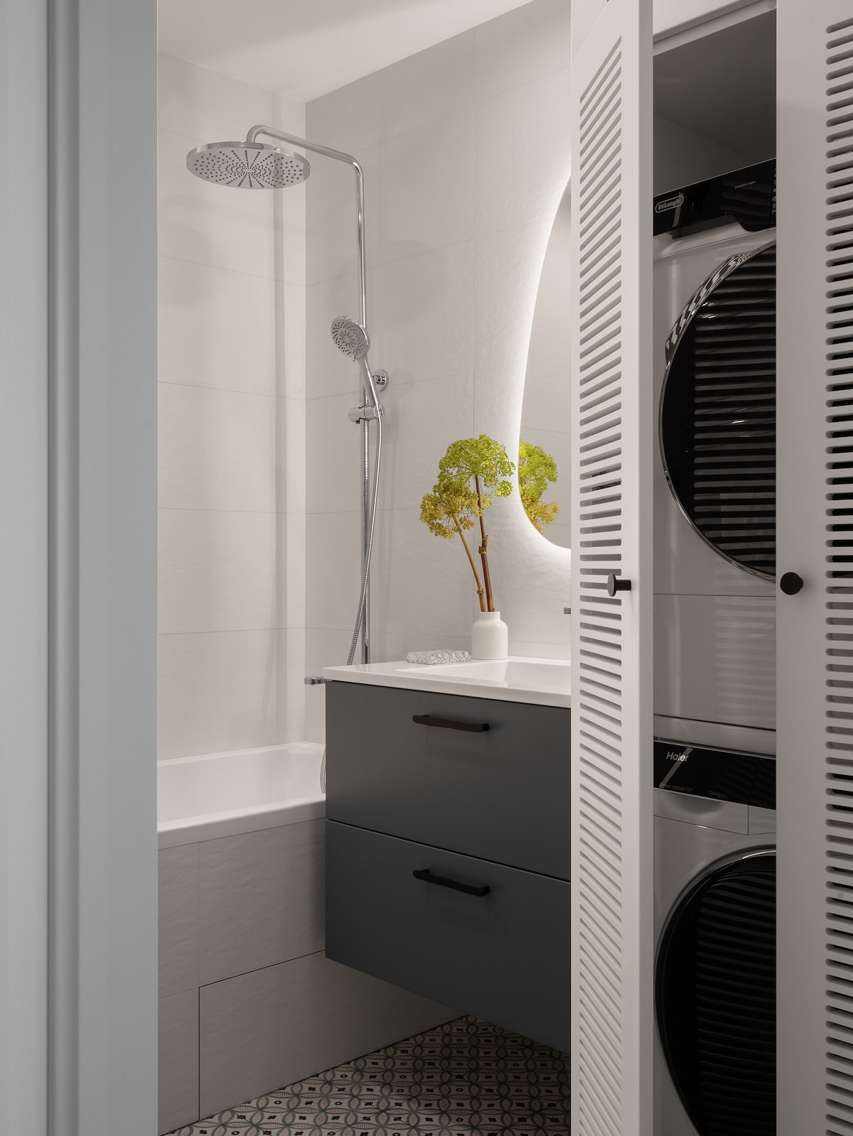 В ванной удалось установить хозяйственный шкаф со стиральной и сушильной машинами. Тумба под раковину выполнена в том же цвете, что и кухня. В санузле — шкаф для хранения над инсталляцией.