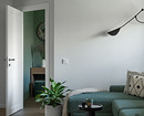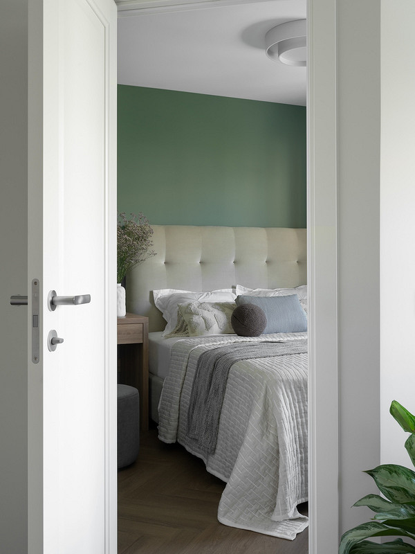 Для отделки стен дизайнер предложила краску. Это практичный материал, который со временем можно обновлять. В гостиной-кухне, коридоре и детской использовали светло-серый оттенок краски. Спальню выкрасили в глубокий зеленый цвет, превратив маленькую комнату в уютную «шкатулку». Низкие потолки не стали зашивать, чтобы не терять их высоту. Напротив, использовали краску под цвет светлых стен. Это, а также мебель до потолка, позволило сделать его визуально выше.