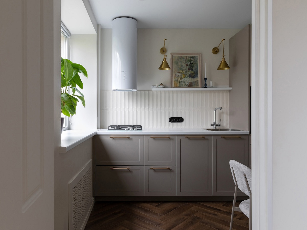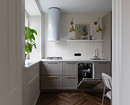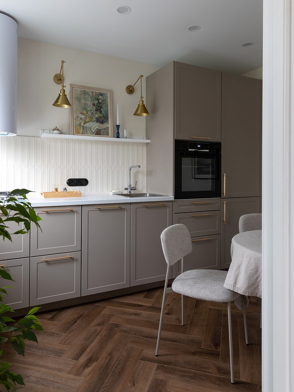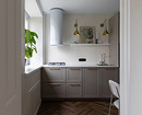 На кухне — линейный гарнитур со встроенным холодильником и шкафом-колонной со встроенным духовым шкафом, а также полками и ящиками для хранения. Над духовкой спрятана микроволновая печь. В нижний шкаф встроена узкая посудомоечная машина, от верхних шкафов отказались, заменив их открытой полкой и хранением в колонне. Также в нижних шкафах достаточно места для хранения в выдвижных ящиках.
