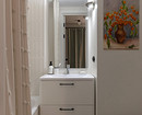 Потолок везде натяжной. Это обусловлено и практичностью, и экономией бюджета. В ванной комнате под потолком спрятаны еще и коммуникации. «За потолком спрятан поворот транзитной трубы для водяного полотенцесушителя, срезать ее нельзя было, но мы согласовали с управляющей компанией возможность вывести ее в сантехнический короб, выход этой трубы скрыт ножками тумбы», — рассказывает автор проекта.
