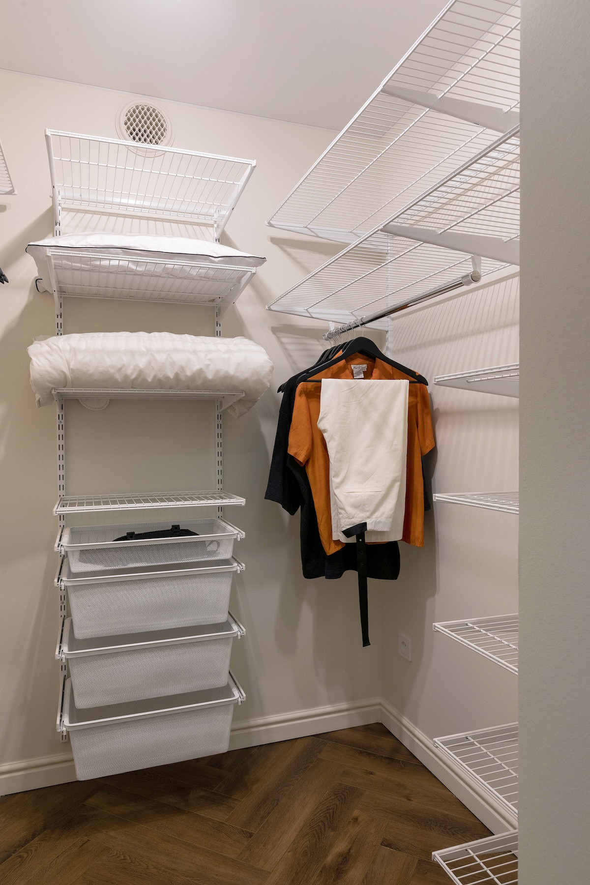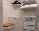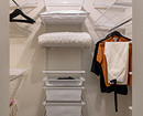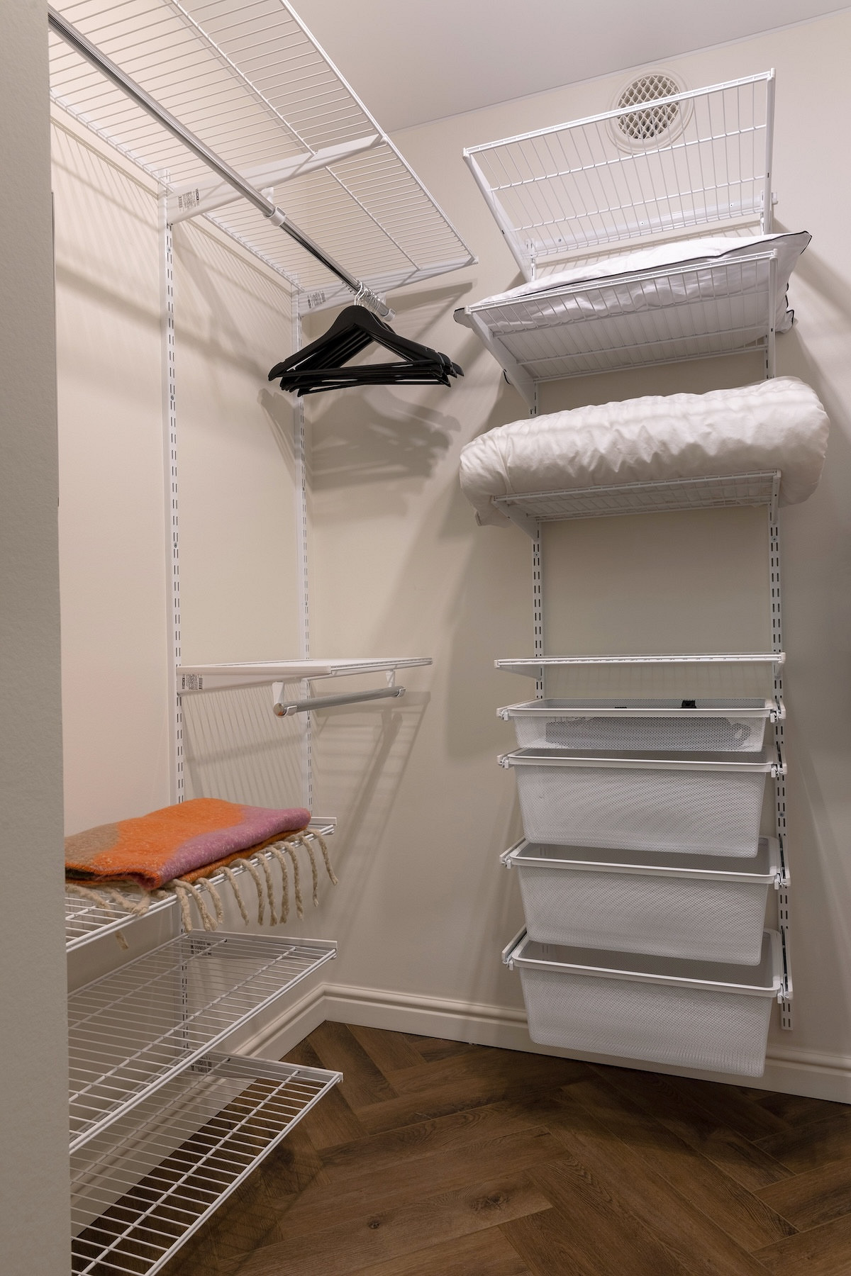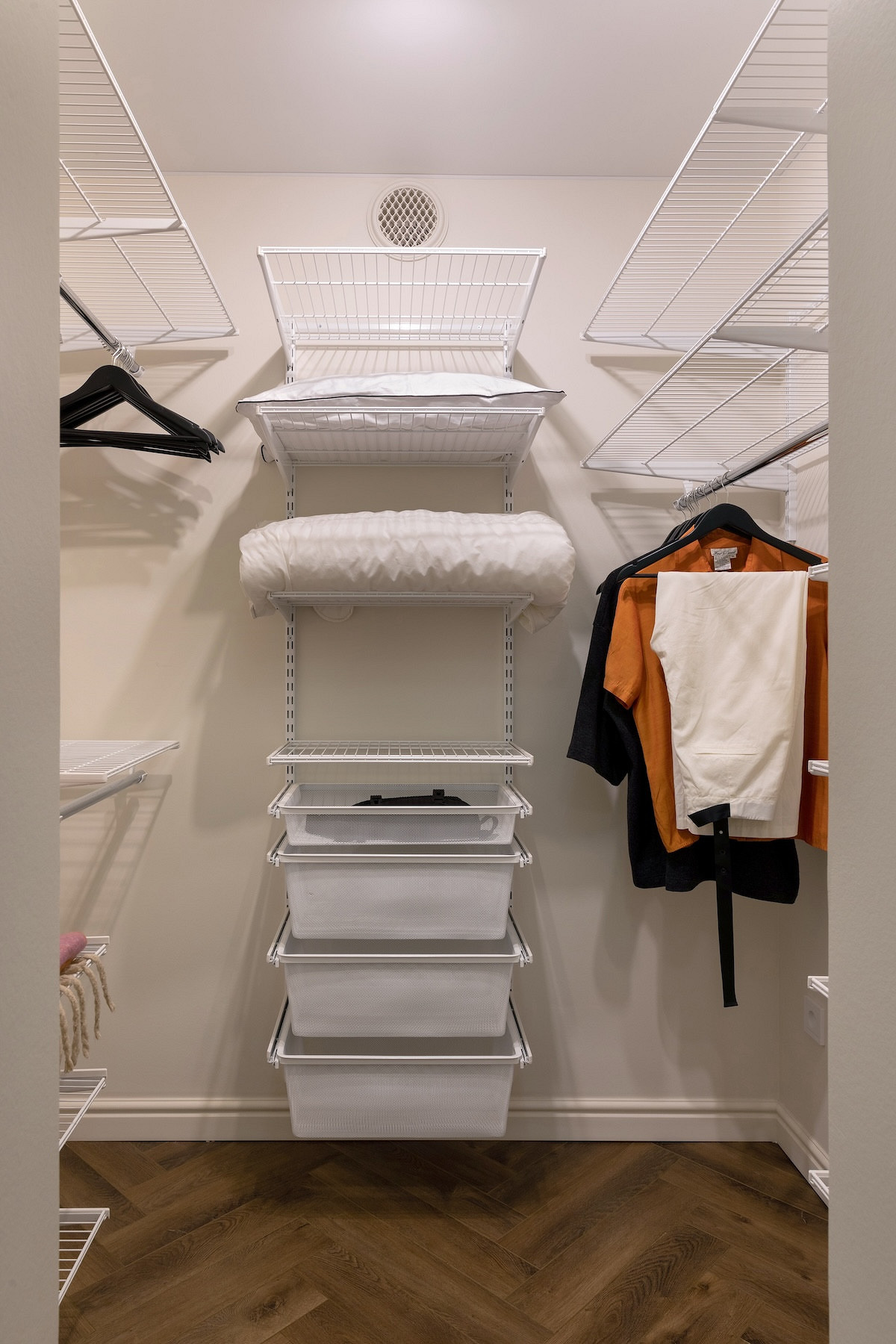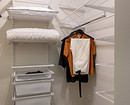 Заказчица просила сэкономить, поэтому дизайнер не рассматривала встроенную мебель на заказ. В прихожей организовали хранение с помощью гардеробной — там есть место и для верхней и повседневной одежды, и полки, и выдвижные корзины, а также место для пылесоса.