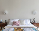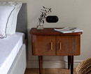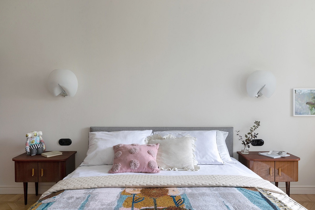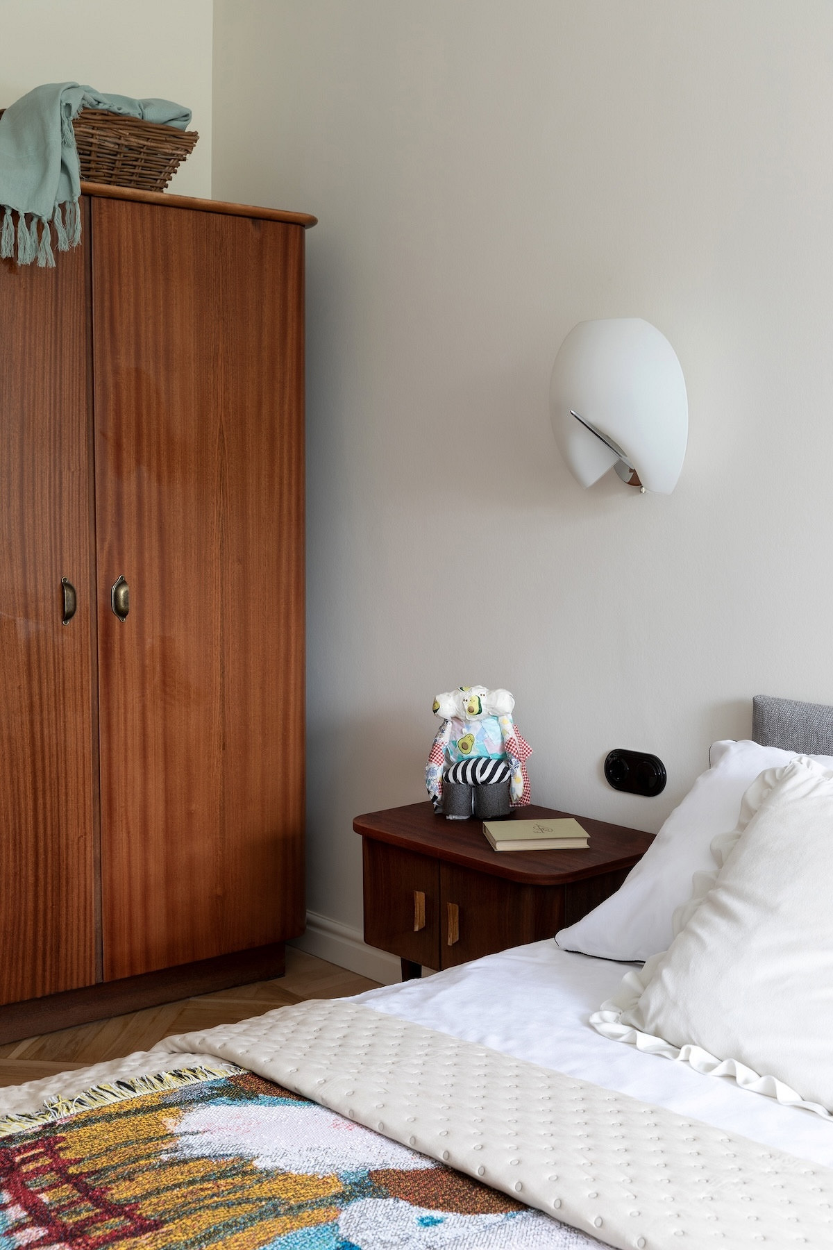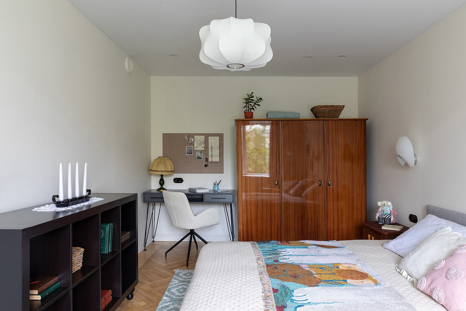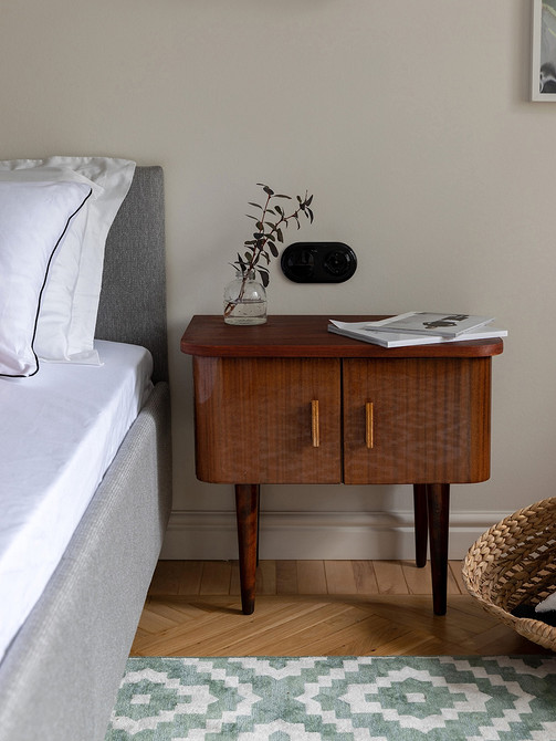 В спальне — двуспальная кровать; винтажные тумбочки и шкаф — из гарнитура «Йоханна III» производства ГДР.