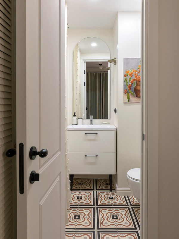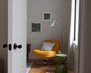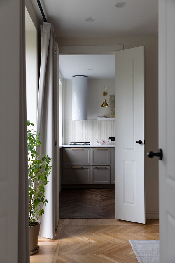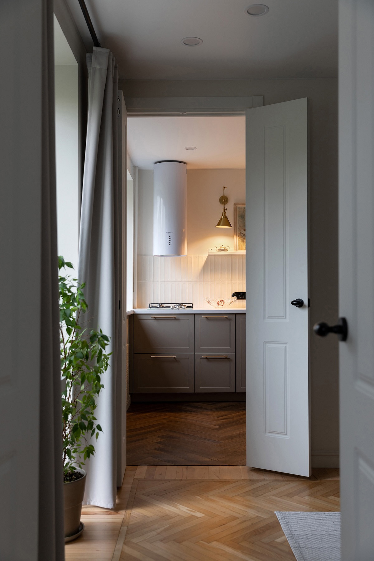 Высота чистового потолка меньше 2,5 метра. Дизайнеру удалось создать видимость большей высоты за счет светлых стен, белого потолка и высоких дверей — выбрали дверные полотна высотой 220 см вместо обычных 200 см.