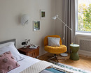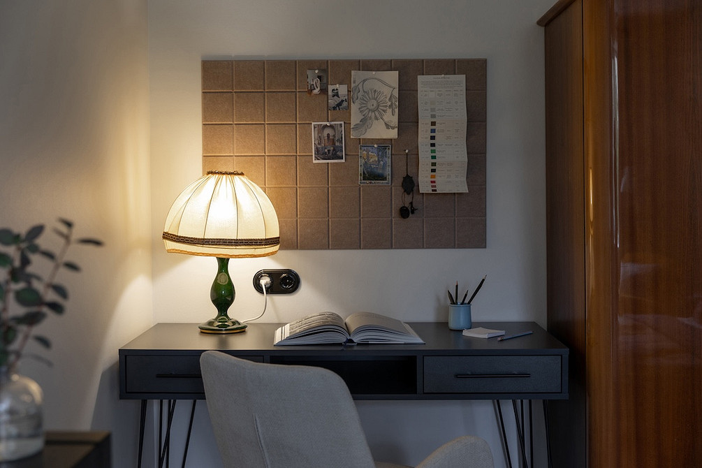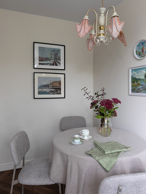 Сценарии освещения разнообразны. Дизайнер использовала винтажные светильники: бра в ванной комнате, подвес над трюмо в прихожей, люстра над обеденным столом. Настольная лампа в спальне досталась от бабушки, как и люстра на кухне. Также есть точечные потолочные светильники для яркого вечернего освещения и люстры в спальне и гостиной — для приглушенного вечернего. Над рабочей поверхностью кухни разместили пару бра.