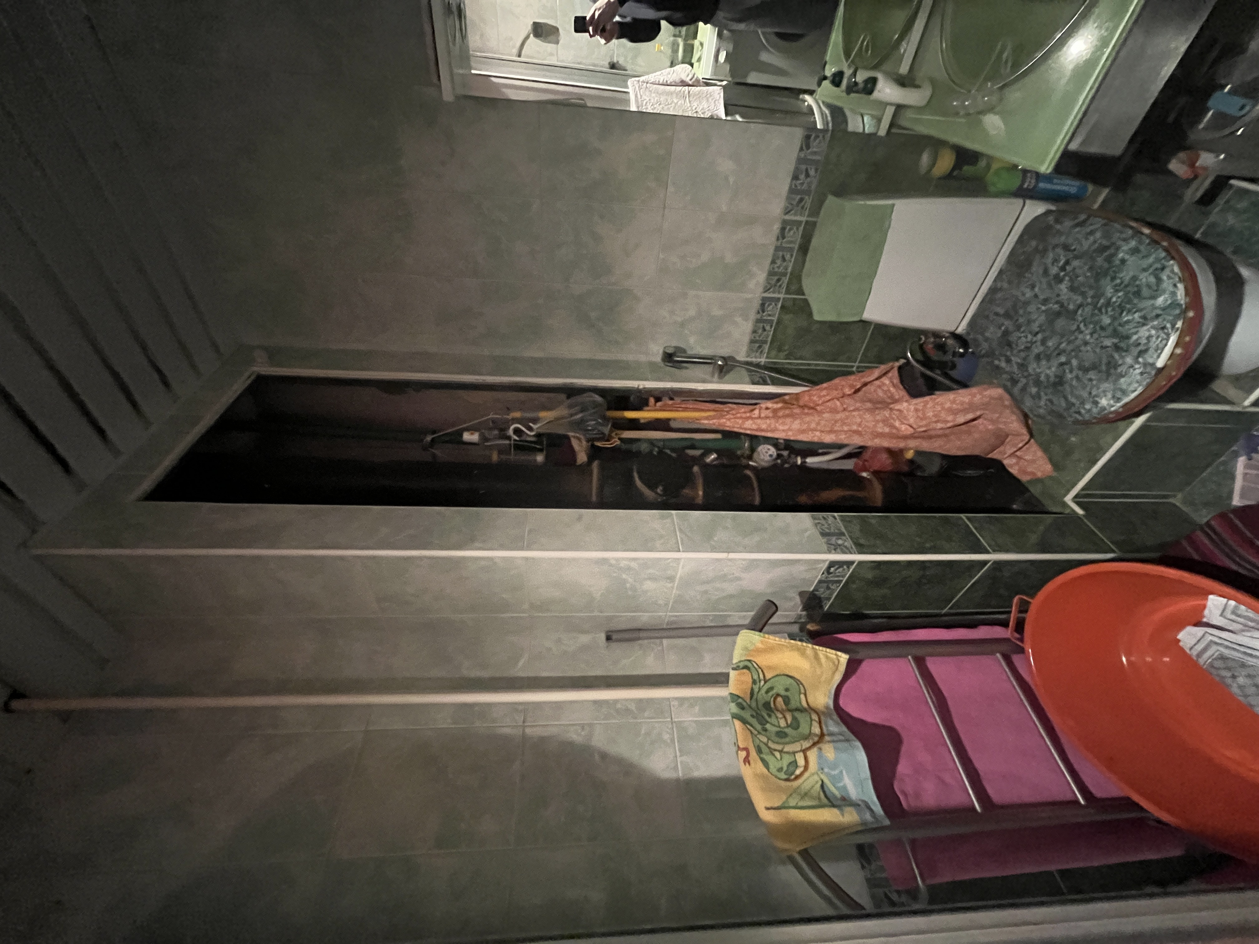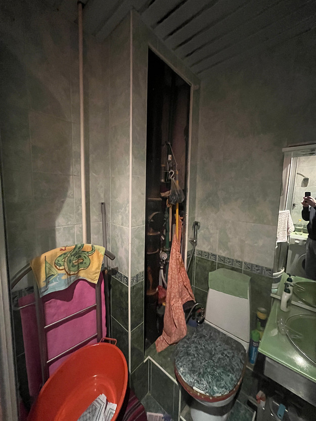 Шкаф для стиральной машины тоже получился бюджетным. Полки нарезали в магазине из ДСП, купили готовые жалюзийные двери, ручки нашли на сайте перепродажи вещей. Внутри шкафа предусмотрели розетку на случай, если жильцы захотят поставить сушильную машину.