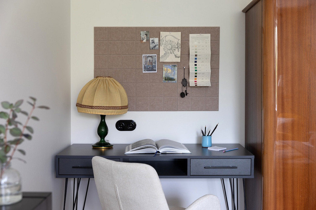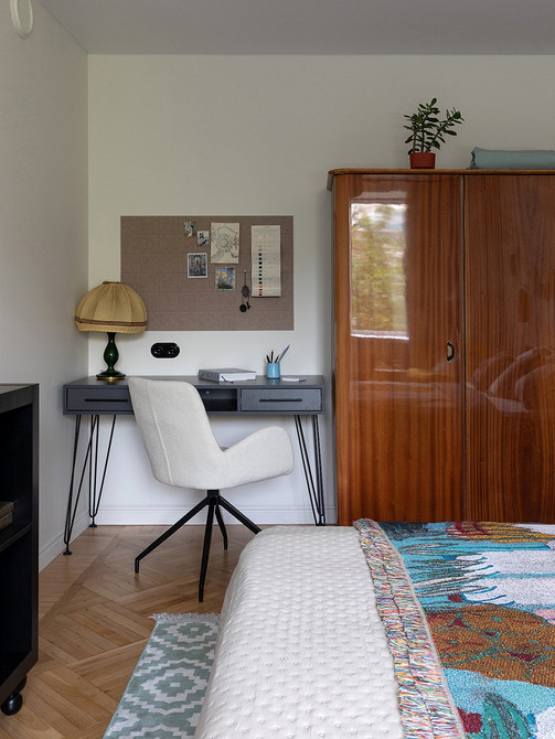 Над рабочим столом разместили фетровую доску, которую можно использовать для крепления заметок. Напротив кровати — стеллаж из ИКЕА, который поставили на ножки. «Простой прием, который превращает массовый продукт в уникальный предмет», — говорит Кристина.